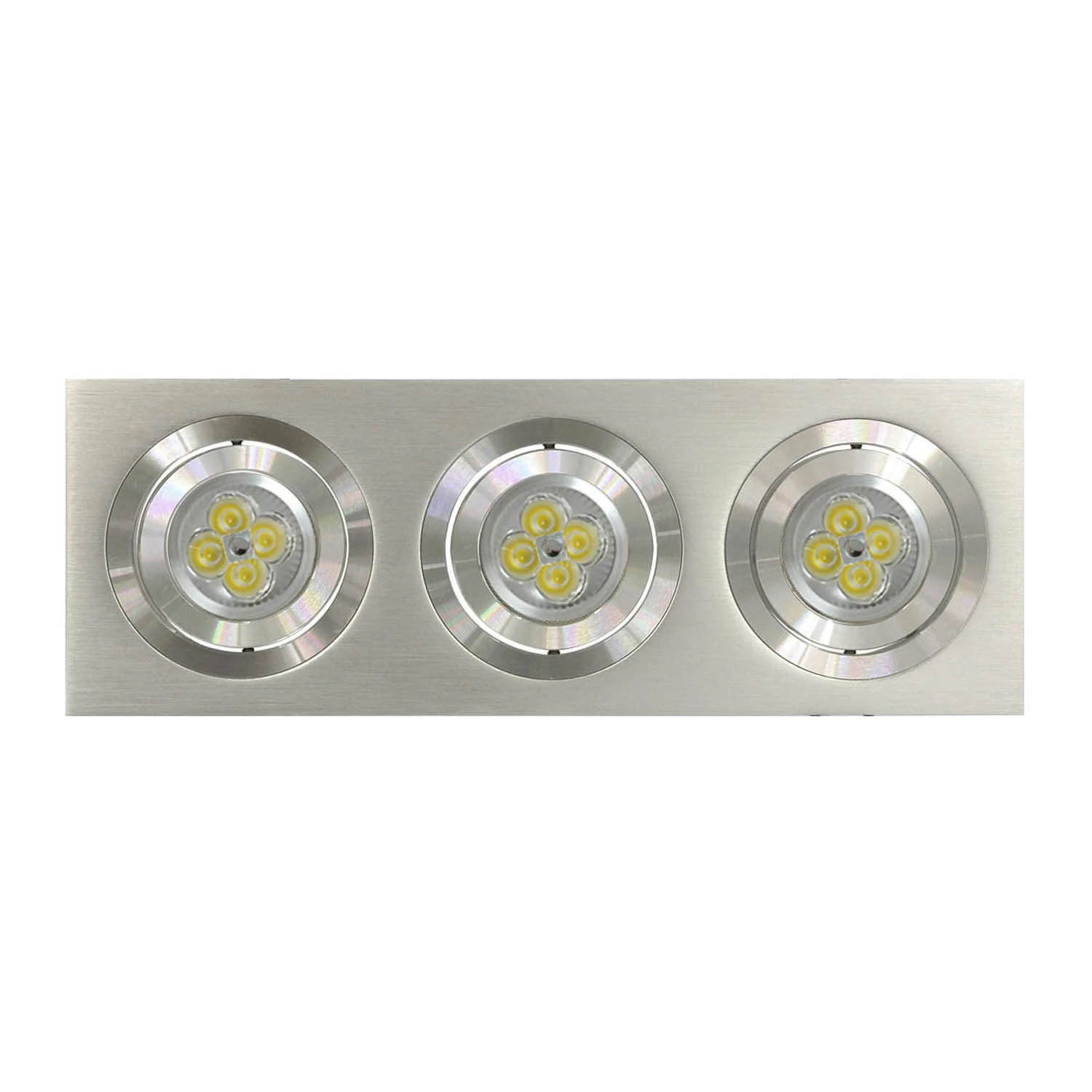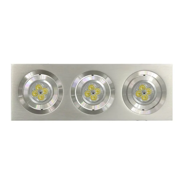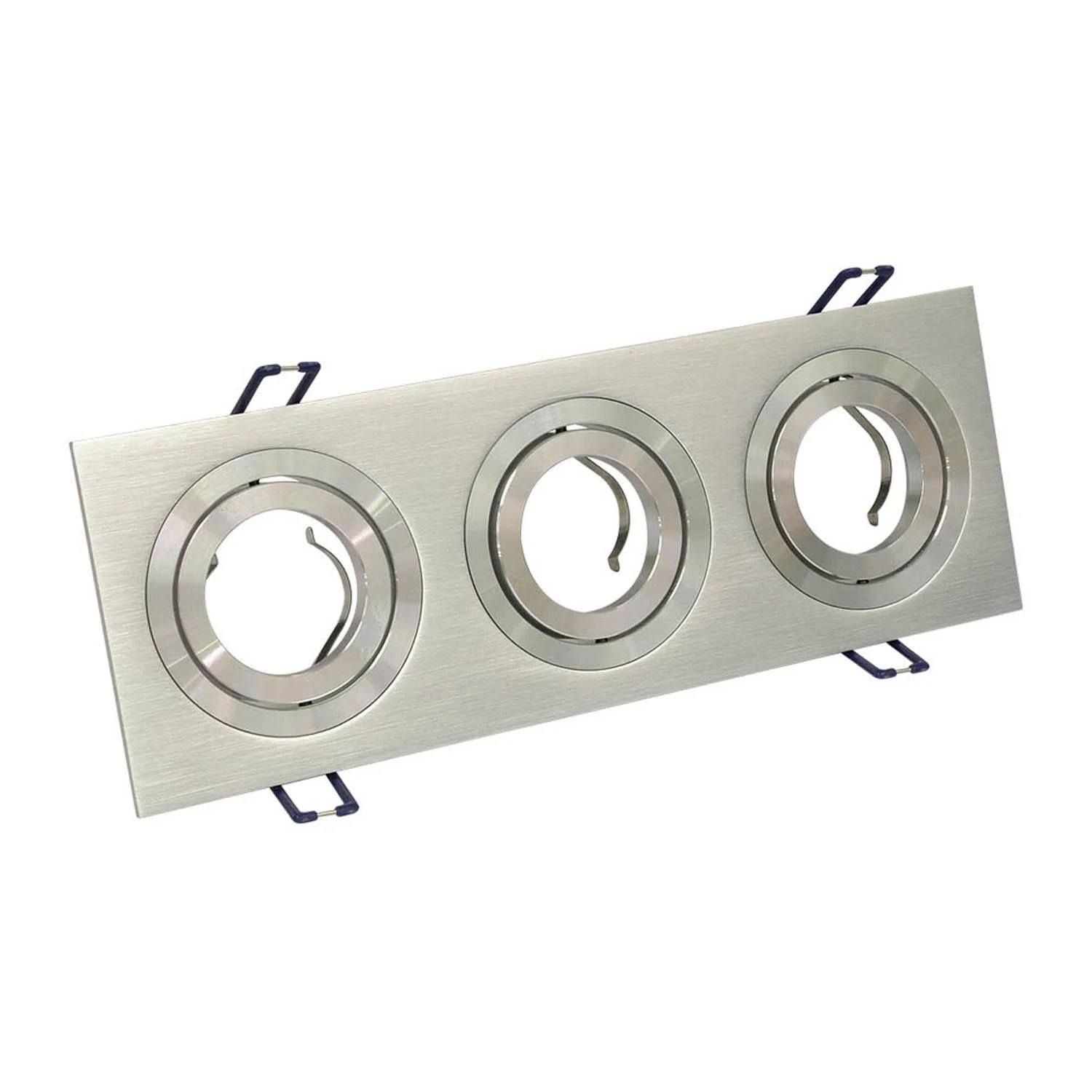 Lampada da incasso rettangolare con finitura in alluminio spazzolato. Questo prodotto è dotato di tre faretti e richiede tre fori di incasso di 8,2 cm di diametro. Questa luce da incasso non include le lampadine. Ideale per uso personale o professionale. Ogni faretto è indirizzabile.