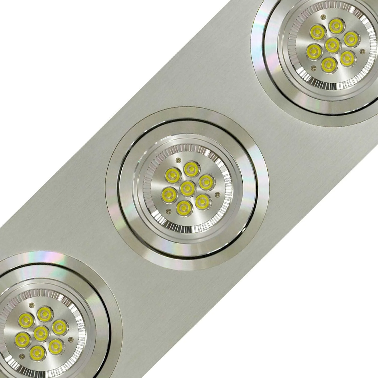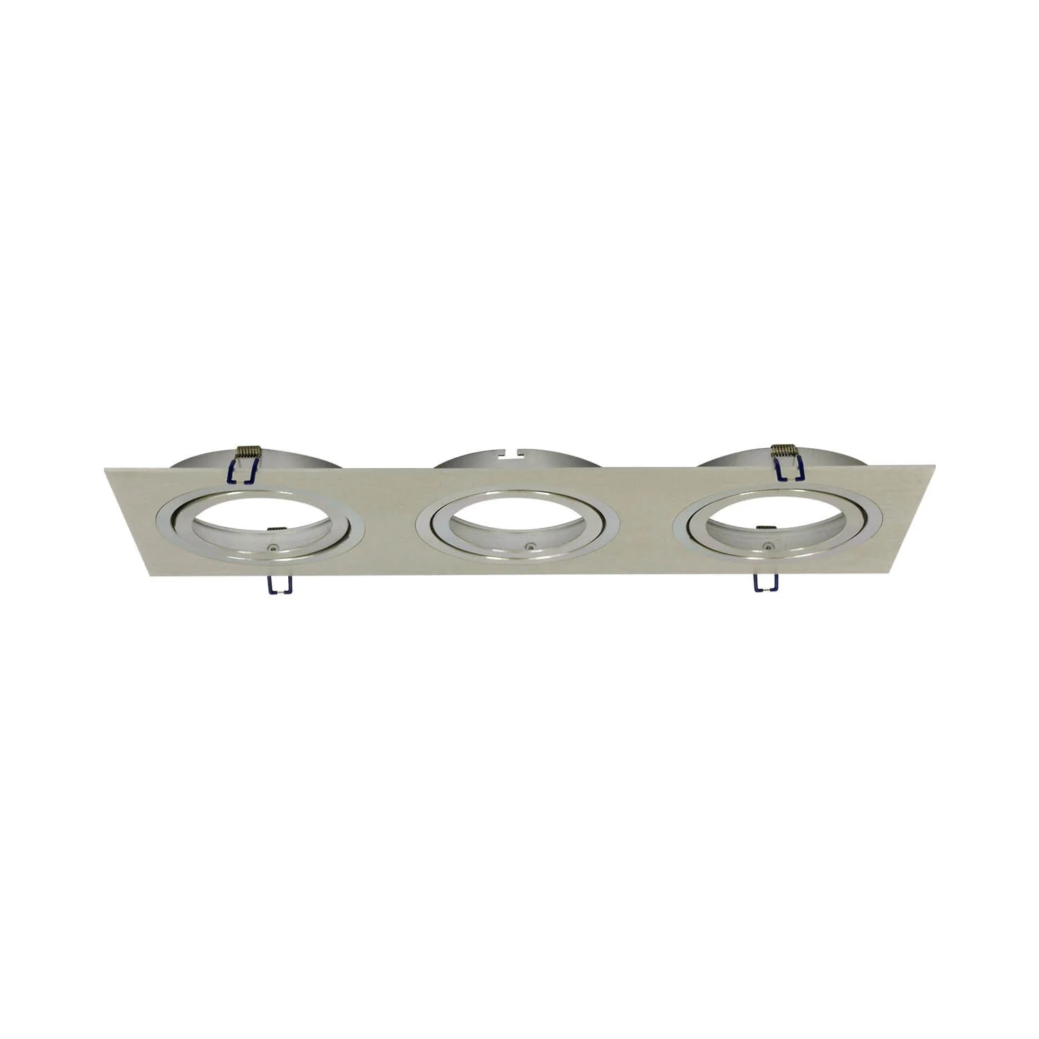 Apparecchio da incasso in alluminio spazzolato. Questo prodotto è rettangolare, adatto a 3 luci e richiede un foro di incasso di 3x15 cm di diametro. Questa lampada da incasso non include la lampadina. Ideale per la casa o l'azienda.