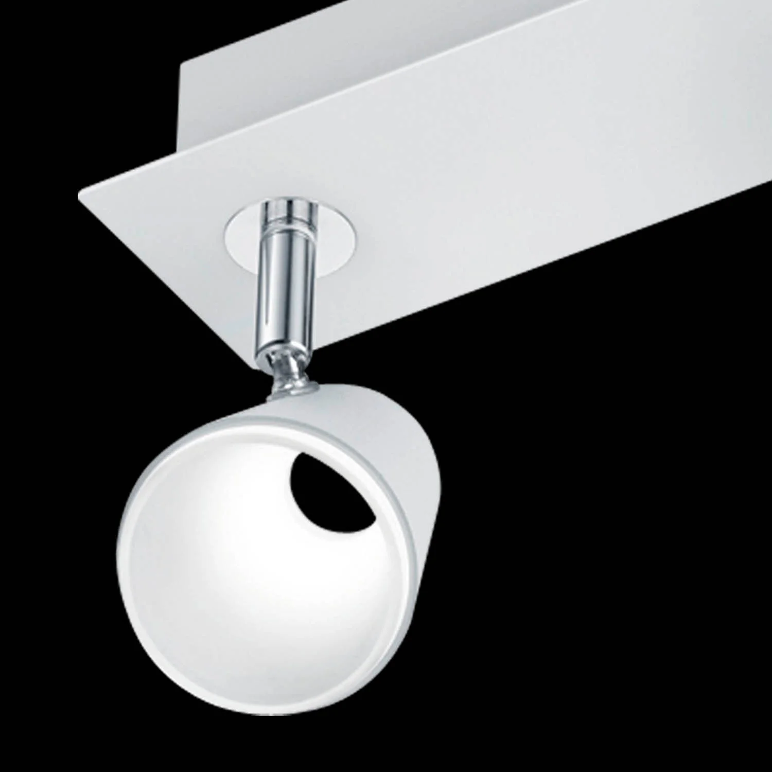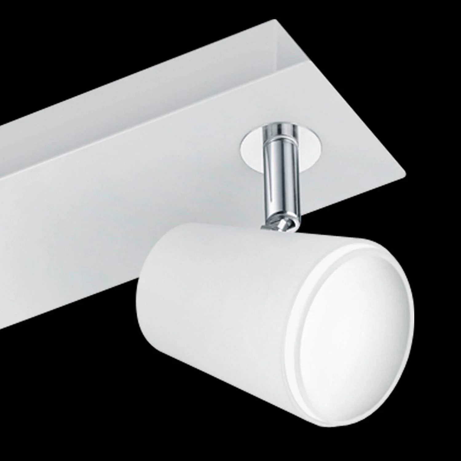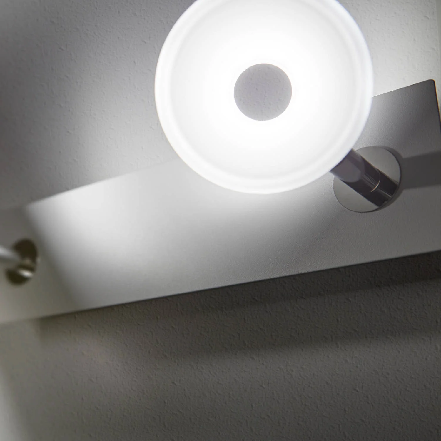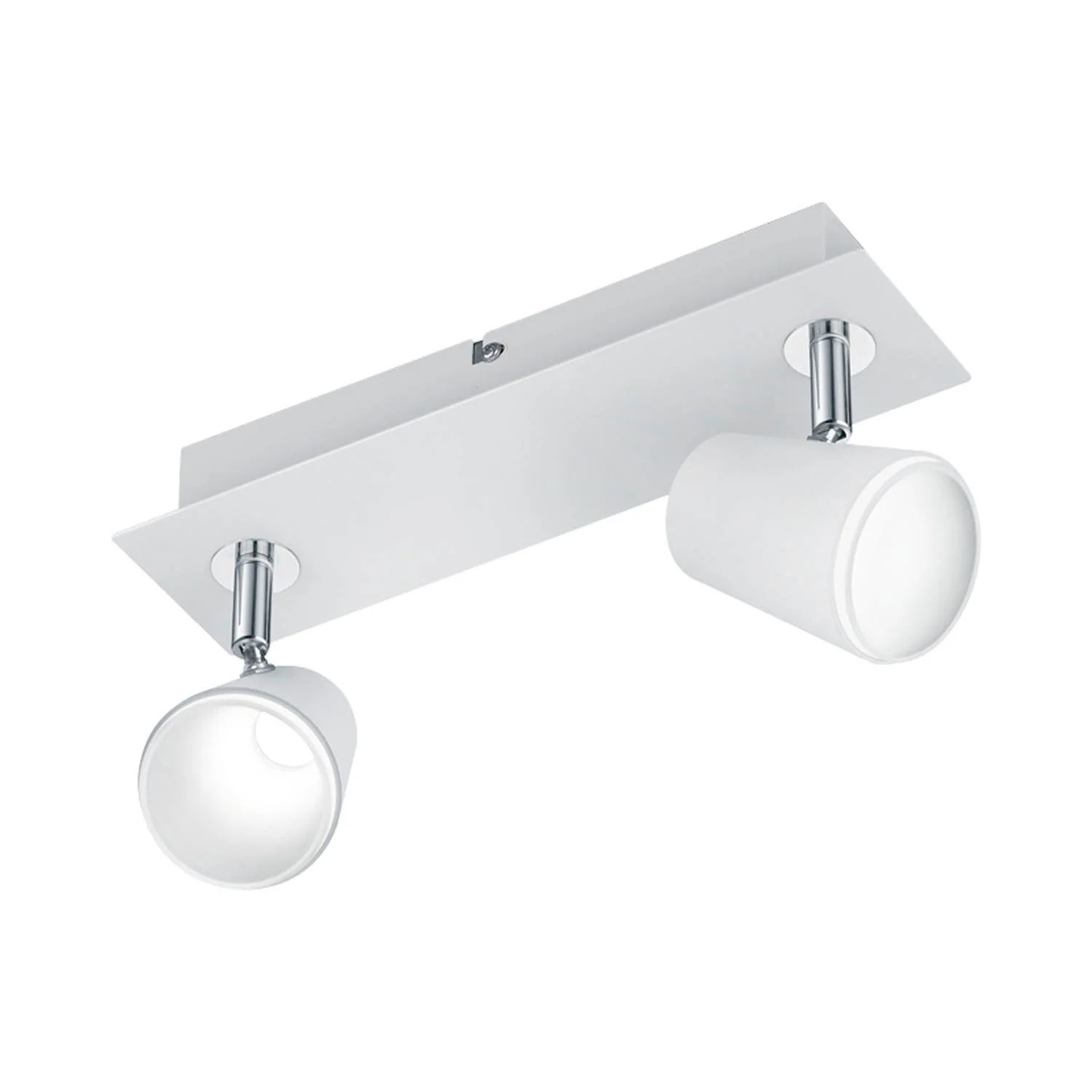 Faretto a due luci in metallo con finitura bianca e cromata e diffusore in acrilico. Fornisce una luce calda a 3000K. Ideale per soggiorni, camere da letto, corridoi e bagni. Ha un design moderno e incorpora un pulsante di accensione e spegnimento.