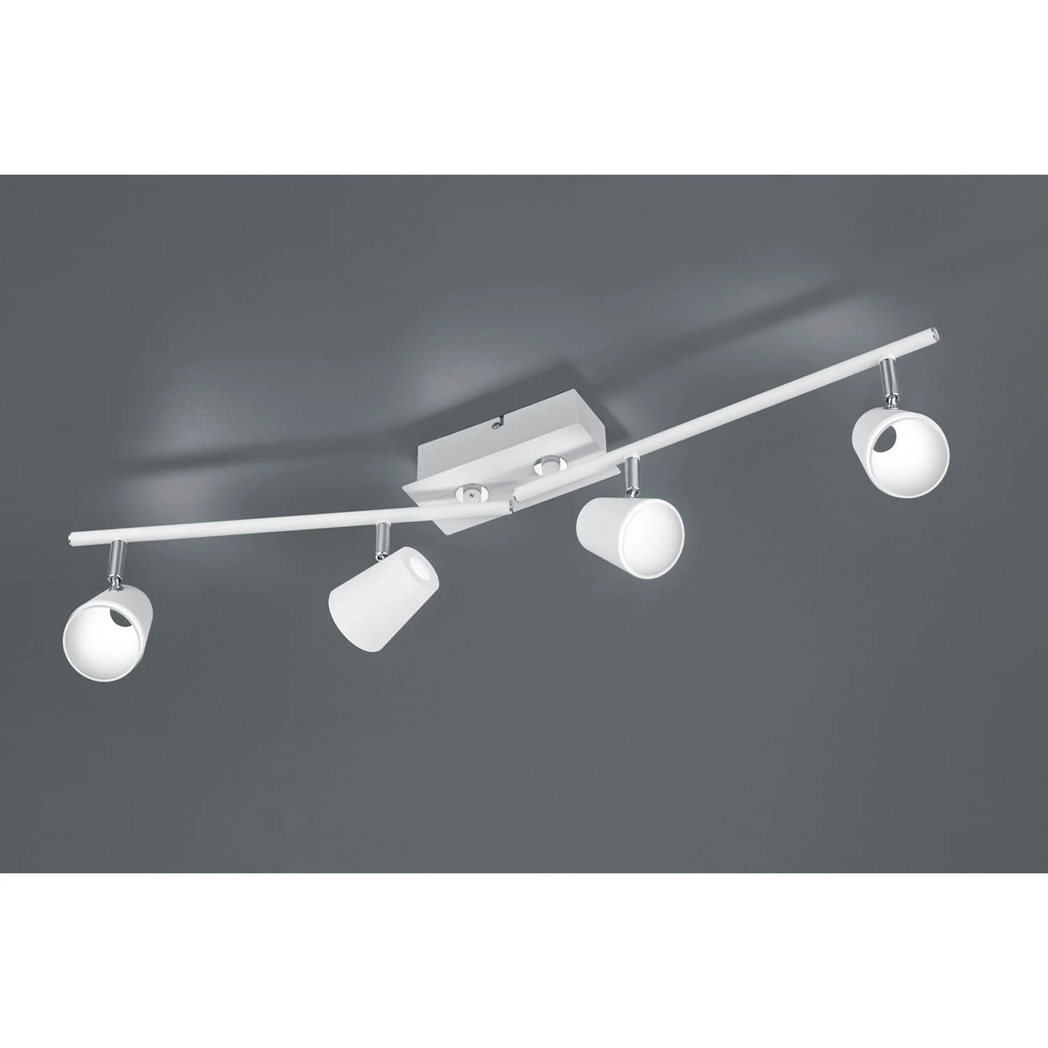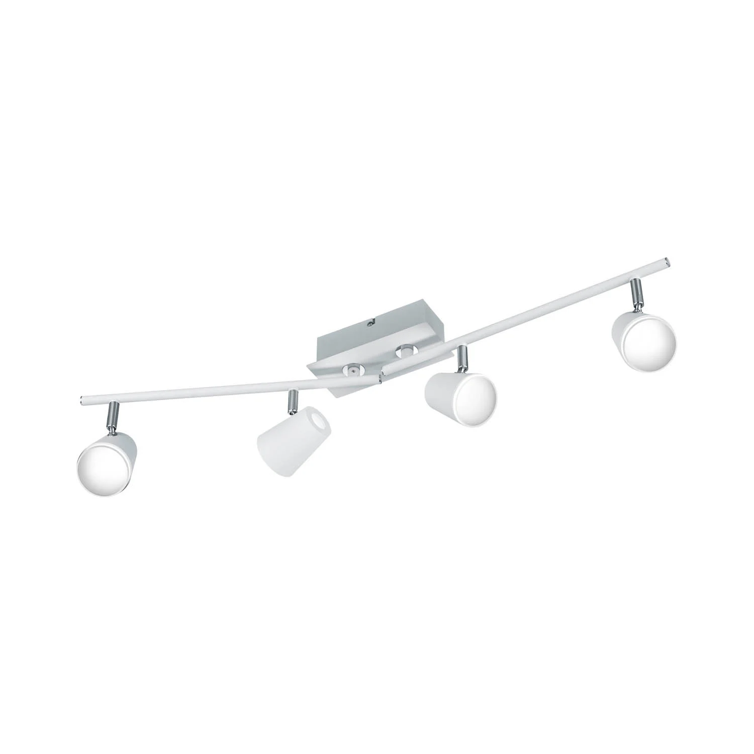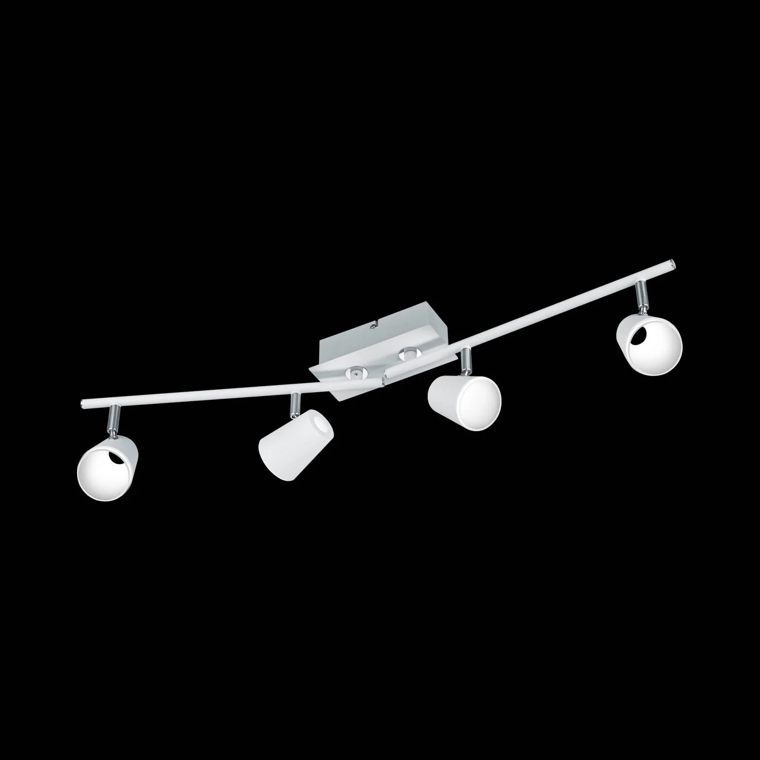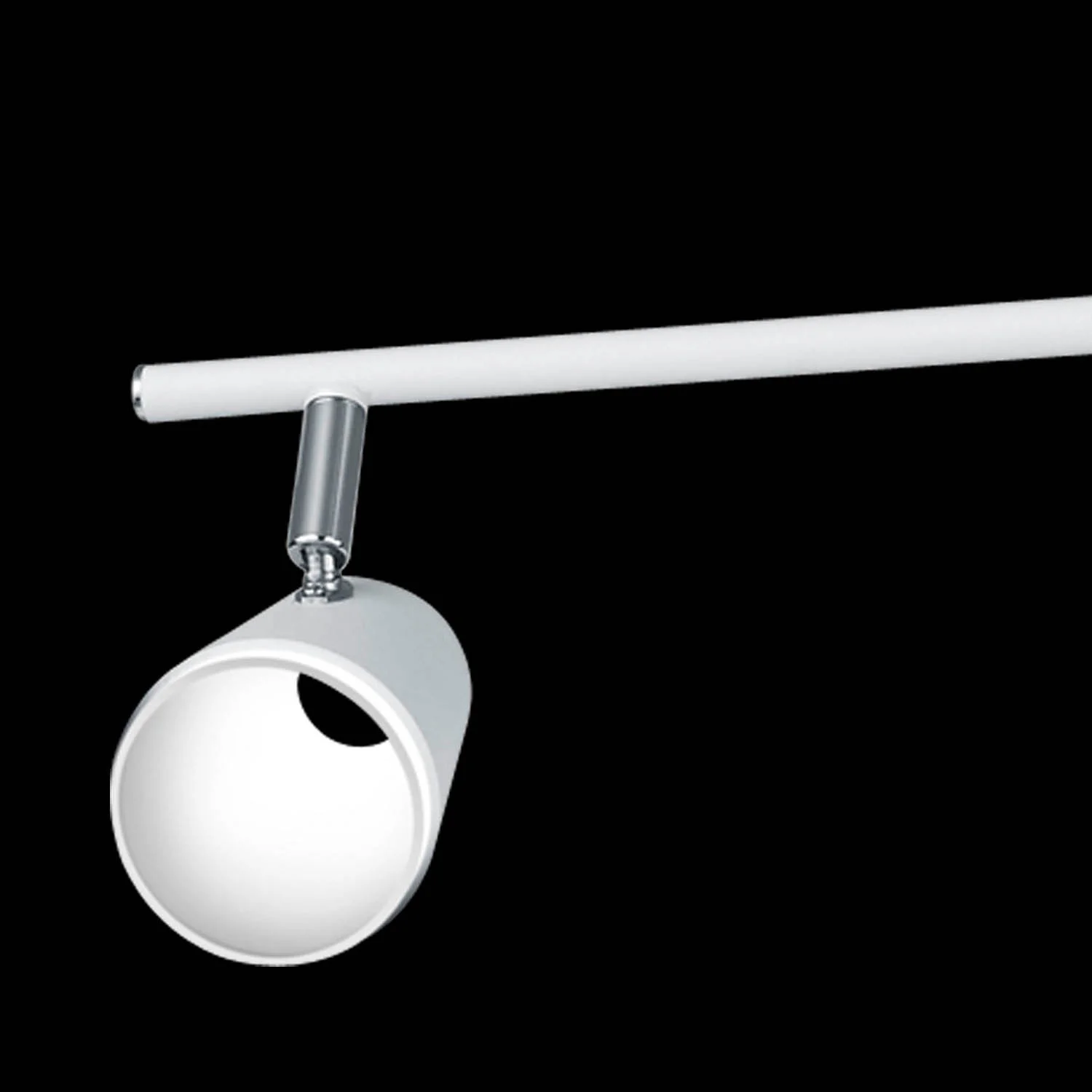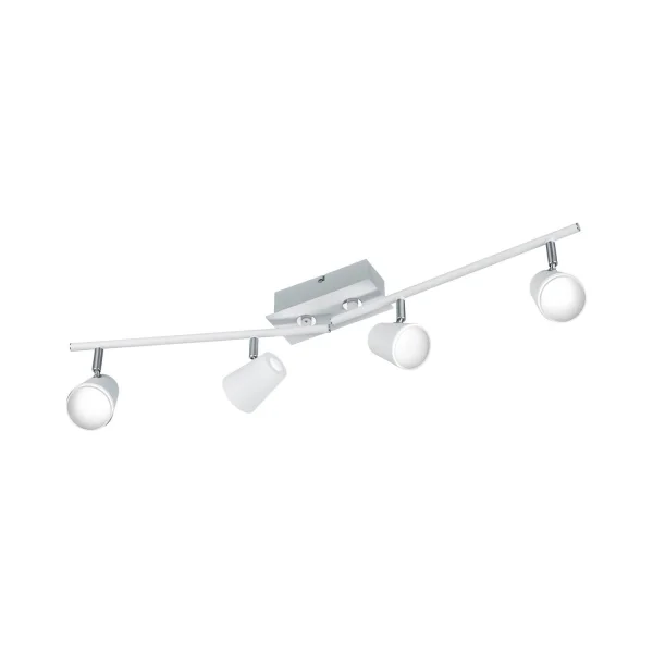 Faretto a quattro luci in metallo con finitura bianca e cromata. Ideale per soggiorno, camera da letto, corridoi e bagni. Fornisce una luce calda a 3000K. Questo faretto a binario dal design moderno può essere regolato per illuminare un punto specifico della stanza.