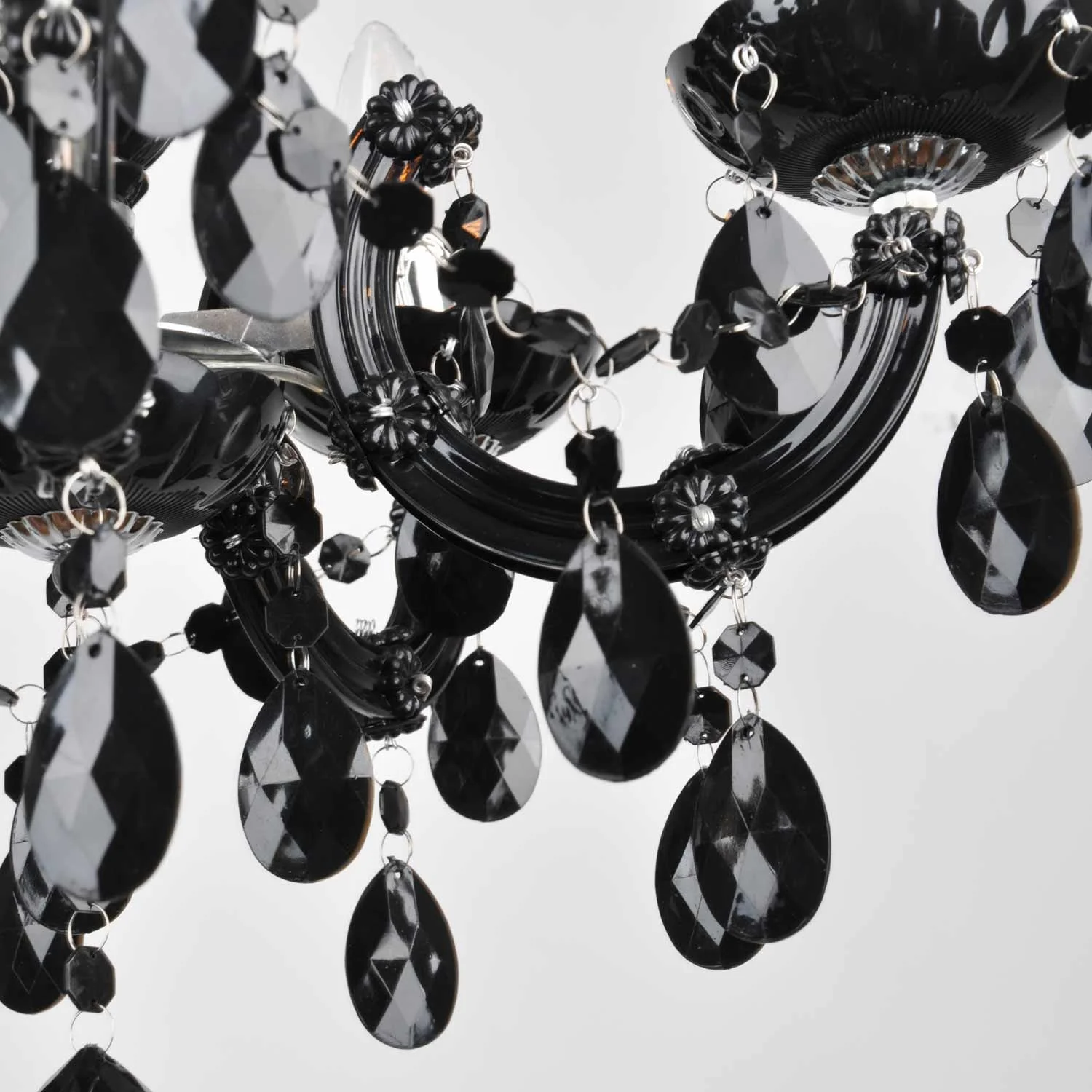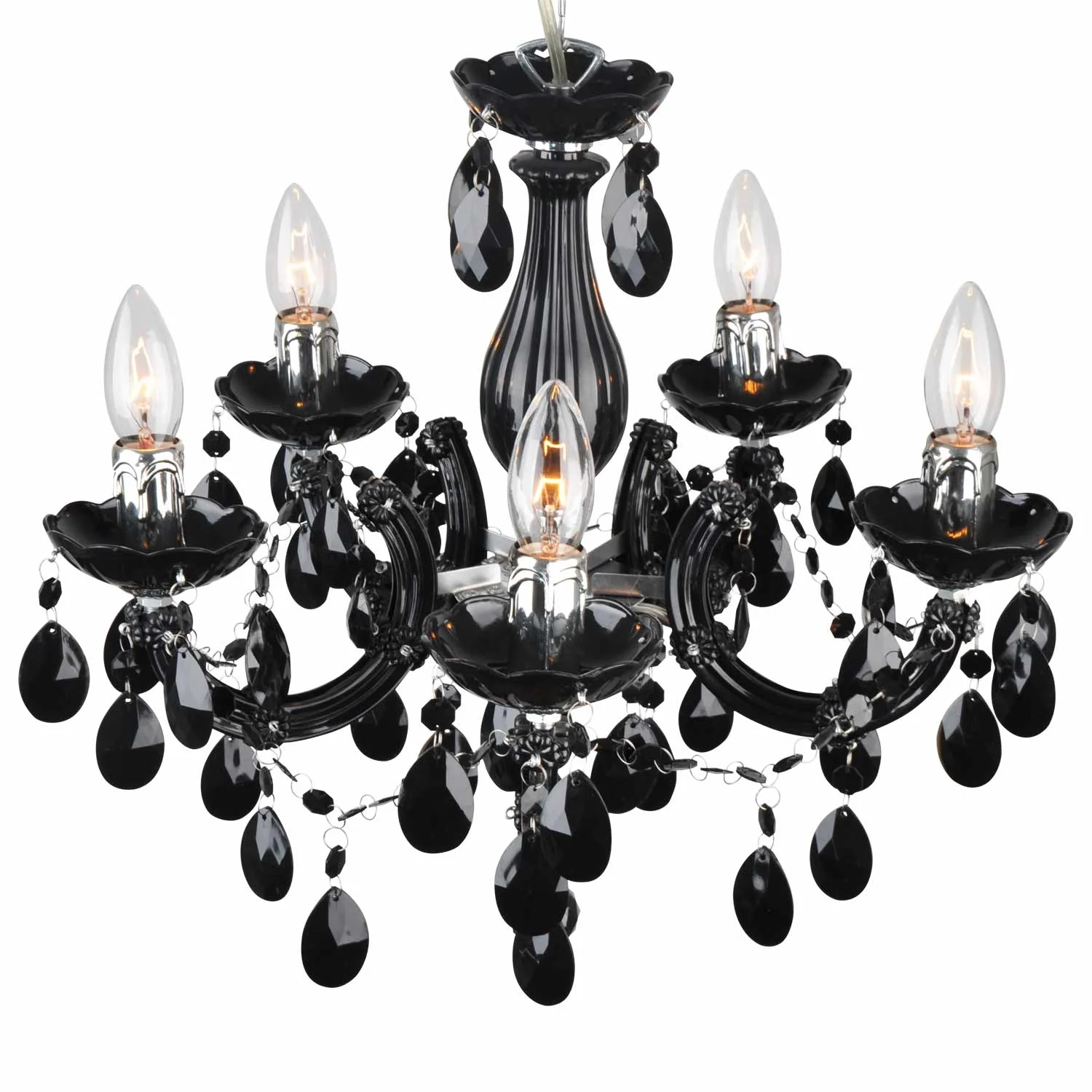 Questa romantica lampada da soffitto è realizzata in acciaio con finitura cromata e acrilico nero. Funziona con 5 lampadine E14 (non incluse). Si consiglia di utilizzare lampadine decorative a candela in stile vintage. Perfetta per illuminare il soggiorno, il corridoio e le camere da letto. Pura eleganza in un'unica lampada che cambierà l'aspetto del vostro spazio.