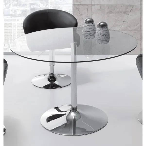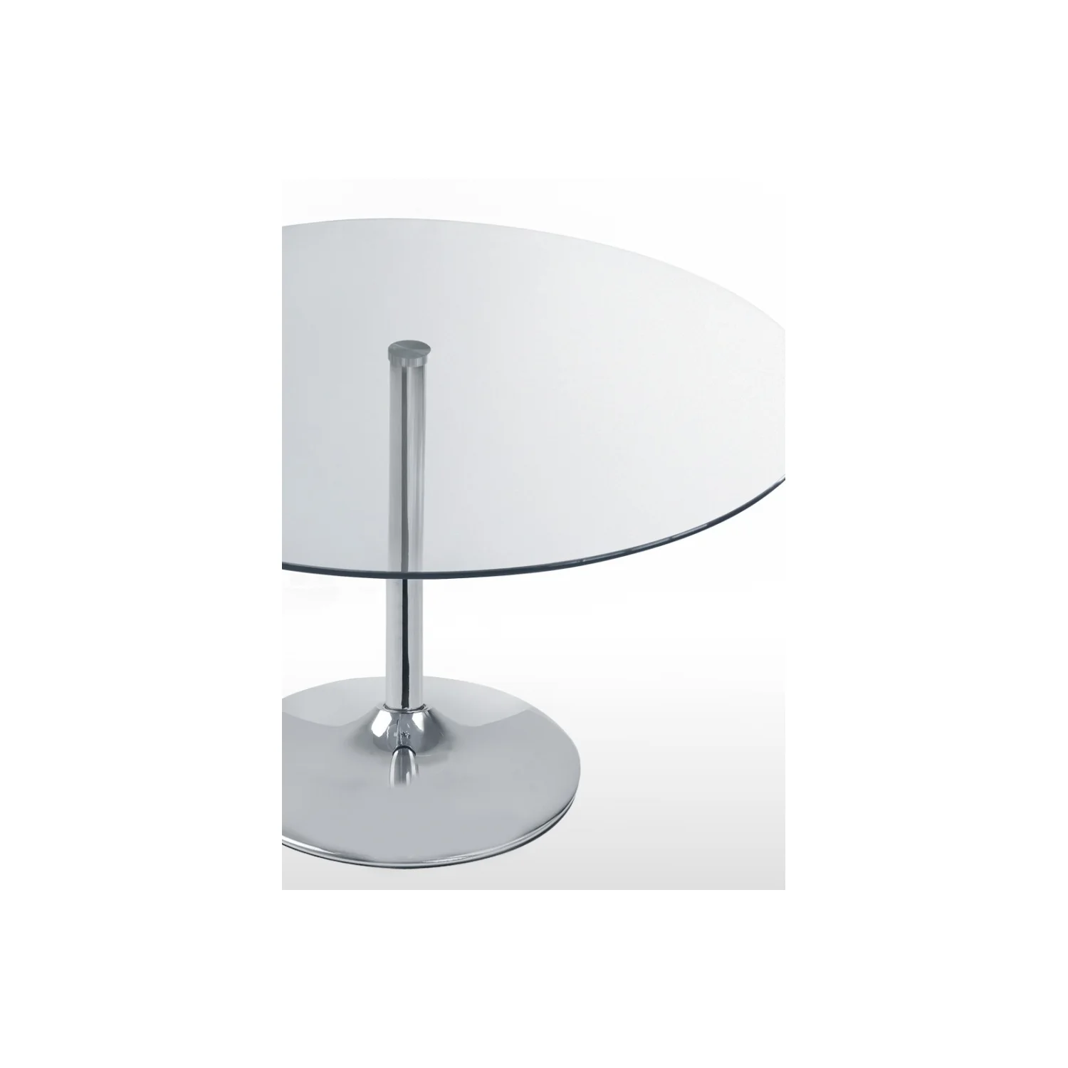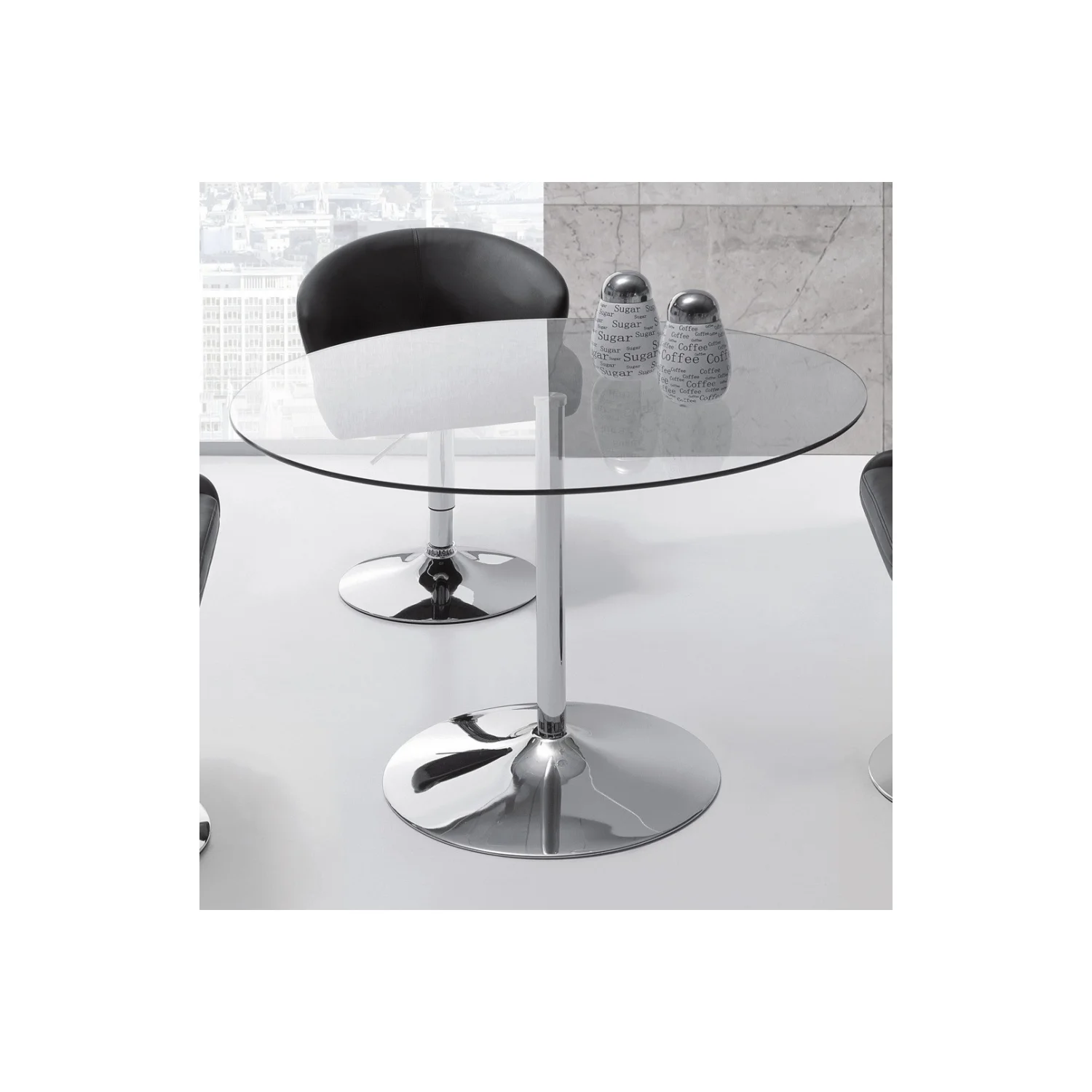 Il tavolo da pranzo Gravity ha una struttura in acciaio cromato e un piano in vetro temperato trasparente di forma circolare e spessore di 10 mm. Perfetto per soggiorni, sale da pranzo e cucine dal design moderno, un tavolo molto raffinato per case eleganti. Ottimo rapporto qualità-prezzo.
