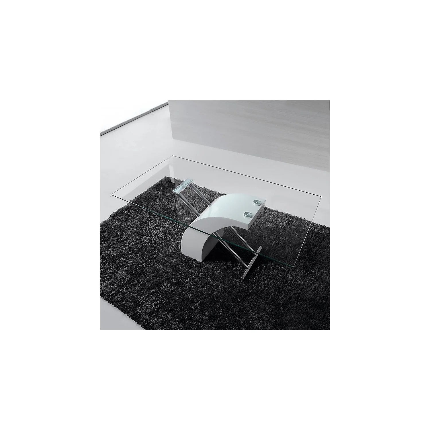 Il tavolino Clarity ha una struttura in MDF (Medium Density Fiber) laccata in colore bianco, con una barra in acciaio che sostiene il piano in vetro rettangolare e trasparente.