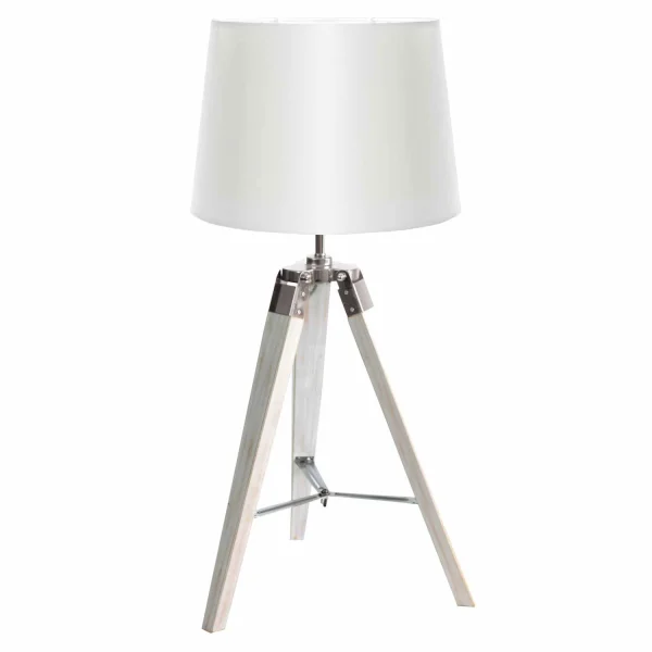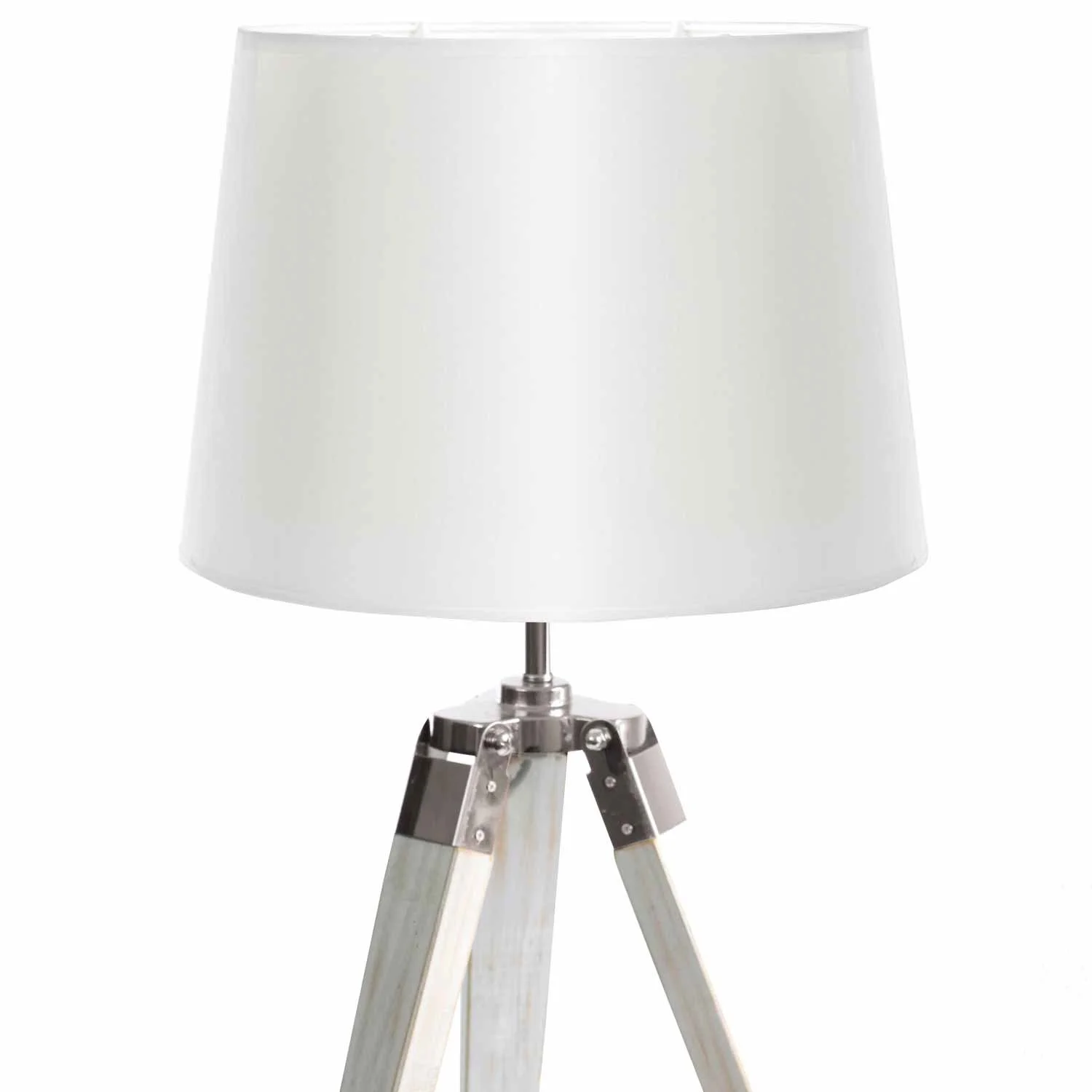 L'originale lampada da tavolo Abril è perfetta per illuminare con stile ambienti come il soggiorno e/o la camera da letto. La sua base è costituita da gambe a forma di treppiede in legno verniciato in bianco antico e acciaio cromato. Il paralume è bianco. Funziona con una lampadina con attacco E27 (lampadina non inclusa).
