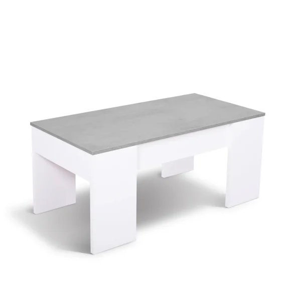 Si tratta di un tavolino sollevabile con una zona di appoggio sul piano di colore cemento che si alza di circa 11 cm grazie al sistema di apertura a cerniera di cui è dotato. Al di sotto di questa zona d'appoggio è presente una nicchia per riporre gli utensili domestici, in modo da tenere sempre in ordine il salotto. Questo tavolo è dotato di quattro gambe con blocchi in ABS e quitaruidos. Il tavolo è realizzato in truciolato melaminico con uno spessore di 30 e 15 mm (MDF/DM). Quando è sollevato può sostenere un peso di 5 kg e quando è chiuso può sostenere un peso di 30 kg.