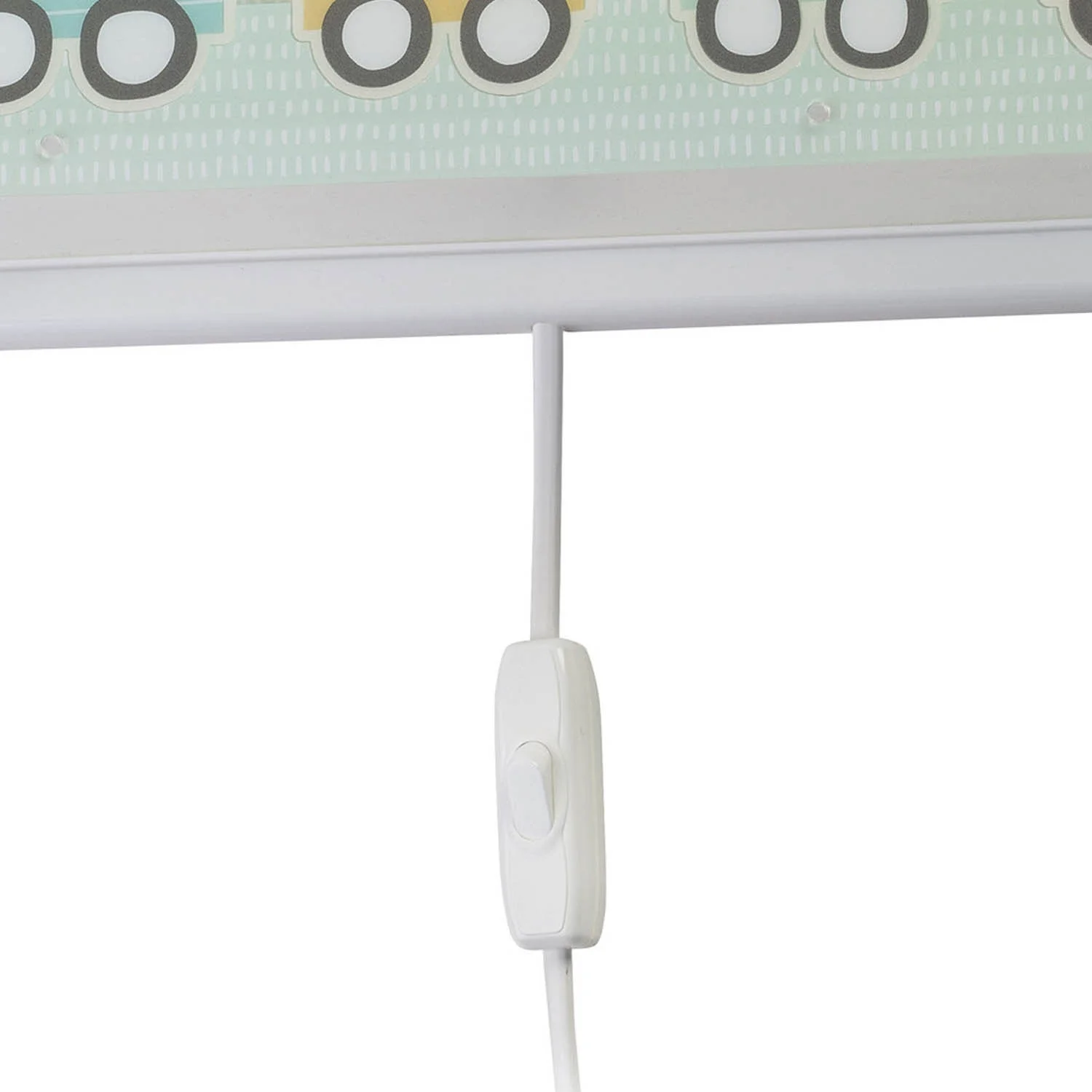 Questa lampada da parete dell'originale collezione The Night Train di Dalber può essere abbinata alla lampada a soffitto della stessa collezione per aggiungere un arredamento divertente alla stanza del tuo piccolo. Il doppio schermo di questa lampada a parete è realizzato in polipropilene trasparente con diffusore di luce inferiore. Grazie al fluorescenza lo schermo servirà come una luce notturna e incantare il vostro peke per brillare nel buio. Può essere installato con e senza cavo con interruttore, in modo da poterlo installare come ti piace. Funziona con una lampadina di bushing E27 massima 60W (bulbo non incluso).