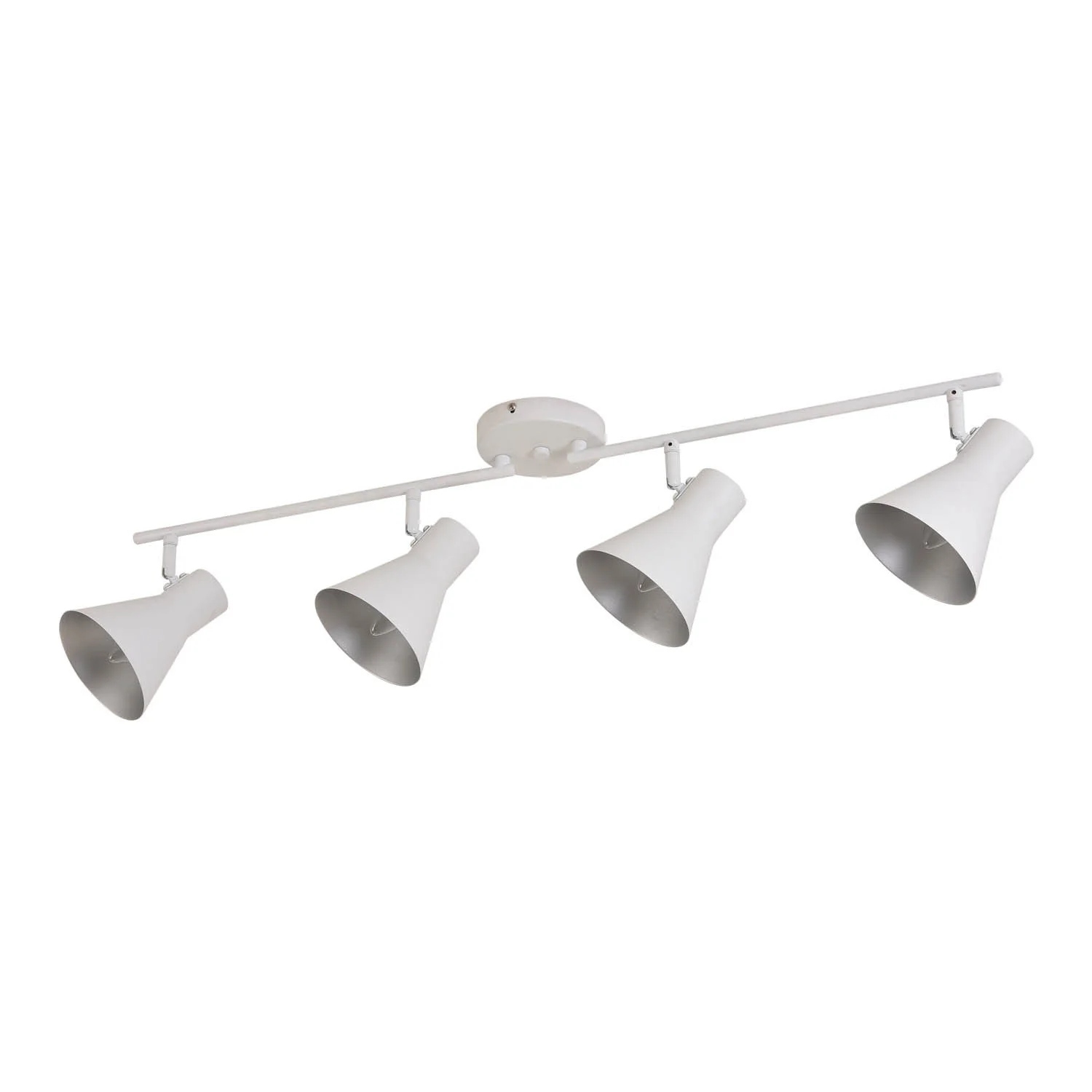 La striscia decorativa a 4 luci Clarence offre soluzioni pratiche per l'illuminazione della casa. I suoi faretti possono essere orientati e ruotati verso un punto specifico della stanza. La struttura della striscia è in alluminio e presenta due diverse finiture, bianca all'esterno e argento all'interno. Funziona con quattro lampadine con attacco E14 (lampadine non incluse). Questa striscia è adatta per il montaggio a soffitto, ideale per aggiungere un tocco decorativo al vostro spazio.