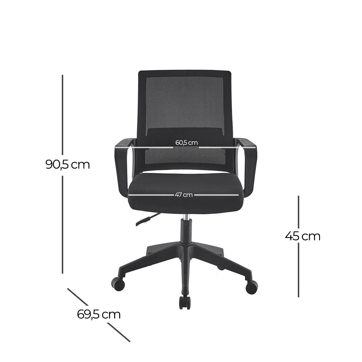 Misure: larghezza seduta: 47 cm, altezza alla seduta: 45 cm, larghezza totale: 60,5 cm, profondità: 70 cm e altezza: 91 cm