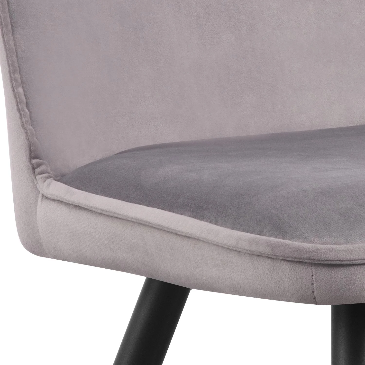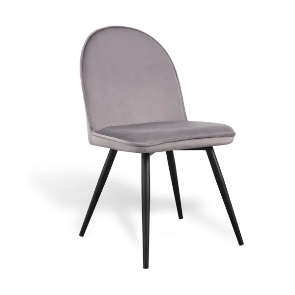 La seduta di questa sedia è rivestita in elegante velluto grigio. Le gambe sono in metallo e sono laccate con vernice epossidica nera opaca.