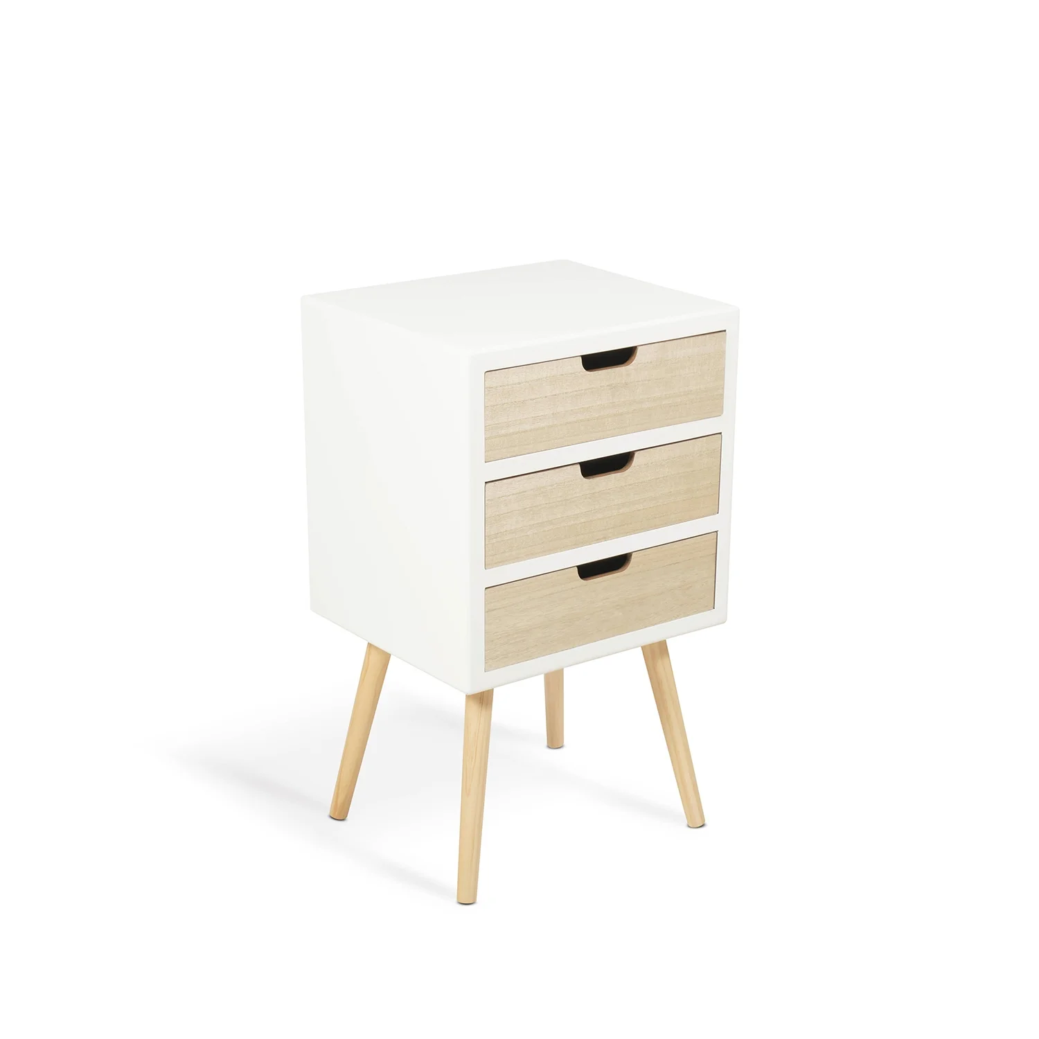 Il comodino Malokai a 3 cassetti ha linee rette ed è realizzato con una struttura in MDF rivestita con impiallacciatura in legno di Paulownia in finitura bianca.