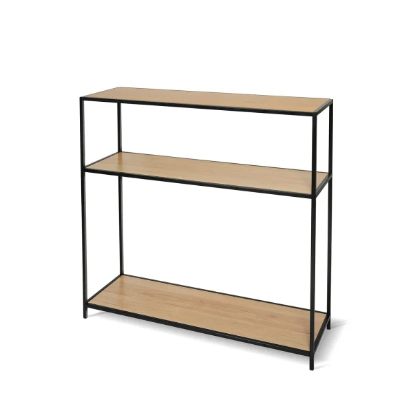 La struttura è in metallo verniciato nero e i ripiani sono in MDF rivestito in multistrato color rovere.