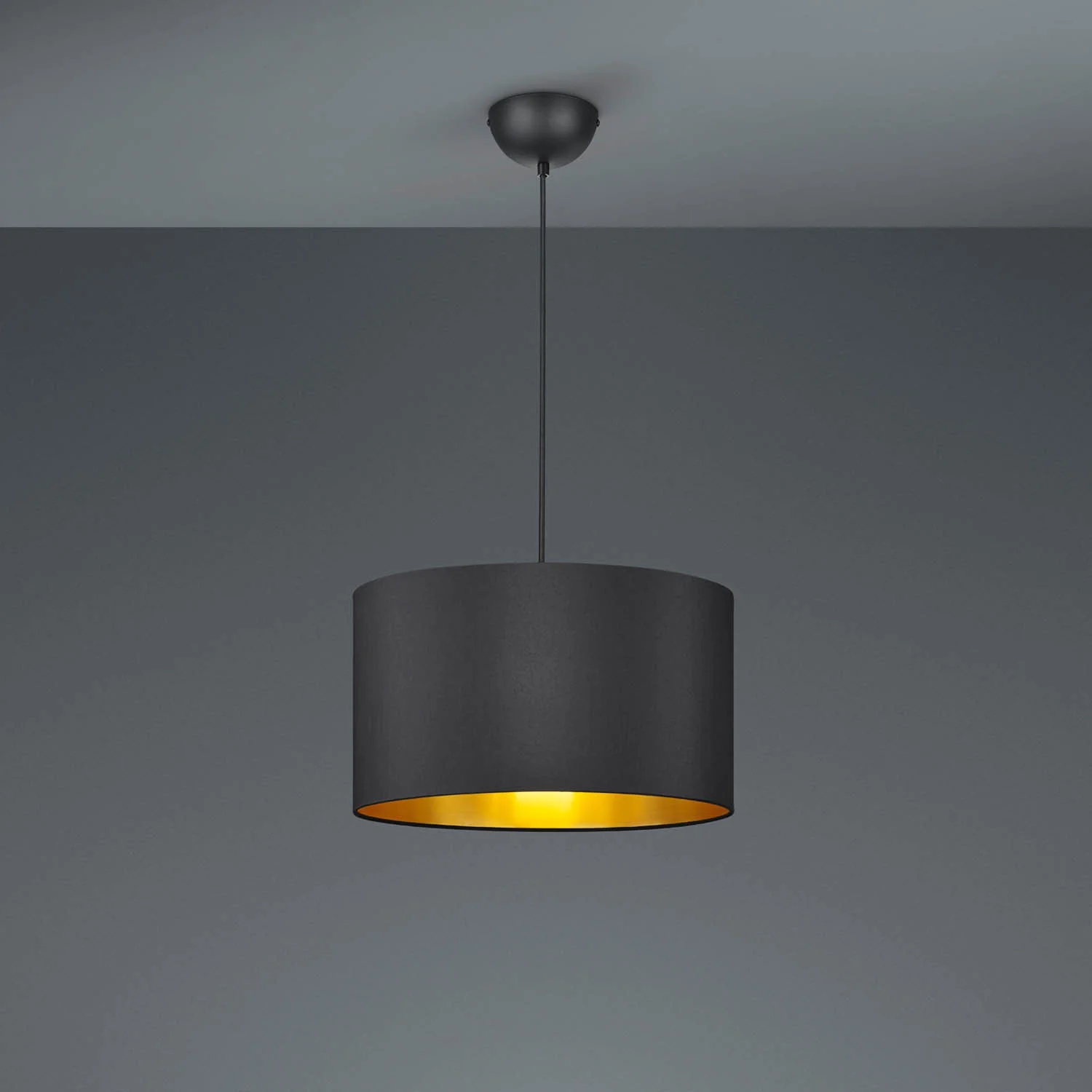 La lampada è composta da una struttura in metallo nero opaco e da un paralume in tessuto con la stessa finitura che misura 40 cm di diametro.