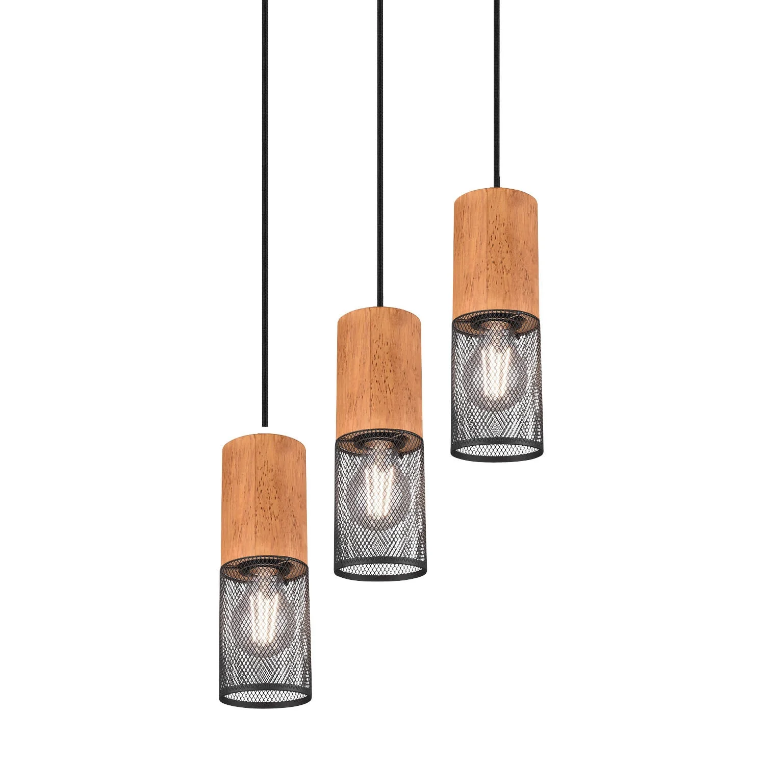 È una lampada composta da tre pendenti il cui supporto è in legno e il paralume è in griglia metallica nera opaca.
