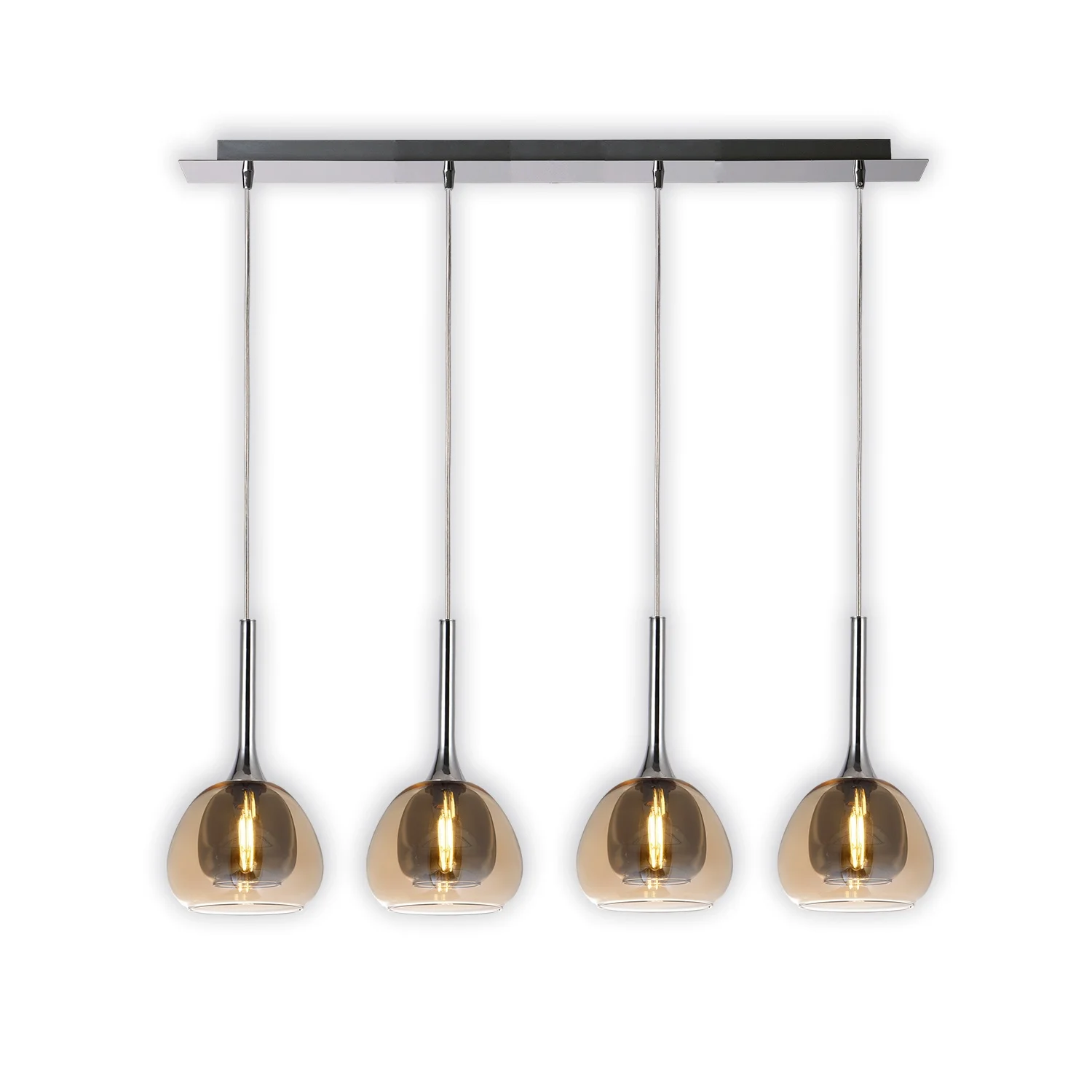La Sospensione 4 Luci Cristallo Esterno Ambra Interno Fumé Nolina presenta una struttura unica con una base rettangolare e un supporto di tulipani in acciaio cromato. Questo design non solo garantisce durabilità, ma aggiunge anche un tocco moderno e distintivo.