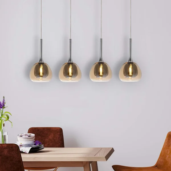 Questo accessorio si distingue come l'opzione ideale per vari ambienti. Dal soggiorno alla sala da pranzo, la Sospensione 4 Luci Cristallo Esterno Ambra Interno Fumé Nolina si adatta a ogni angolo, aggiungendo stile e funzionalità.