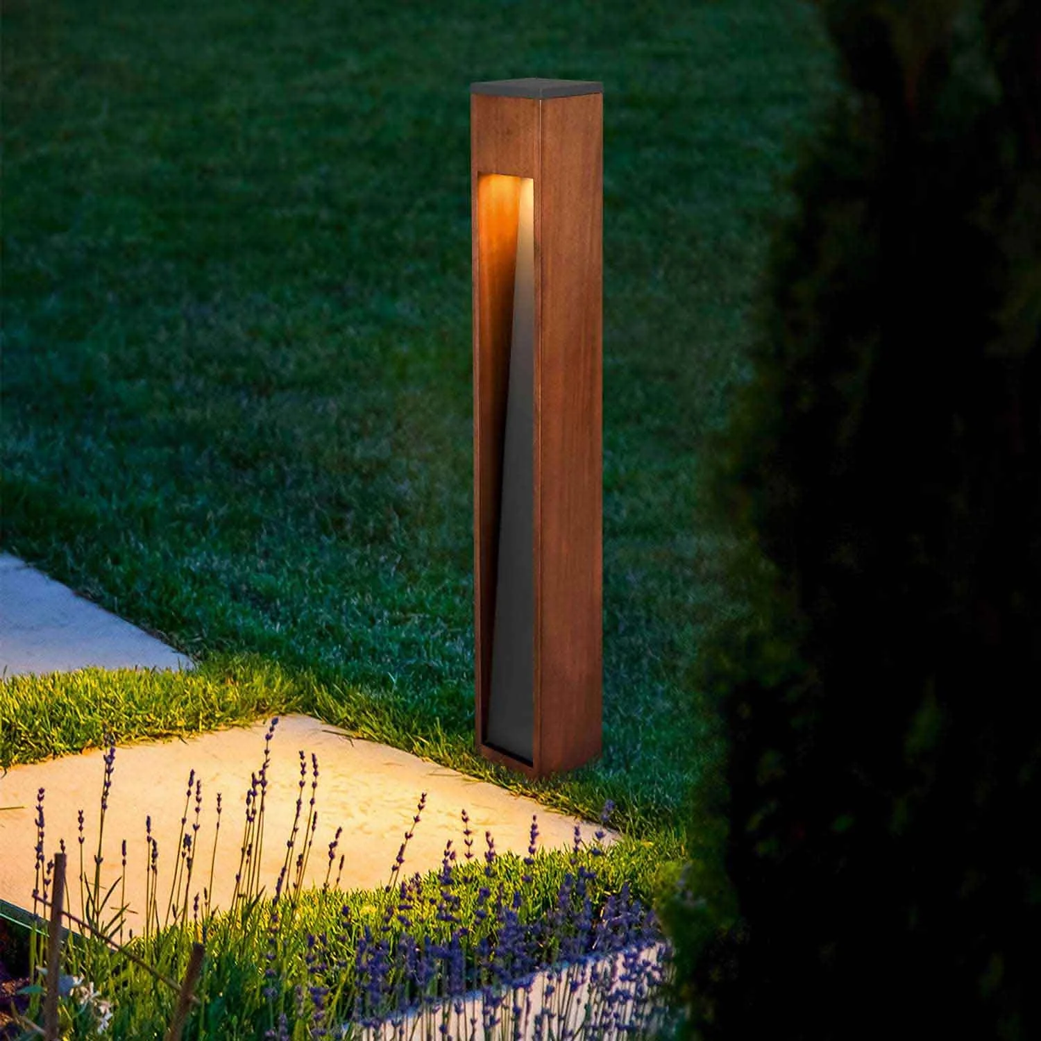 La struttura di questo faro da esterno è fatta di legno con una finitura color legno naturale.