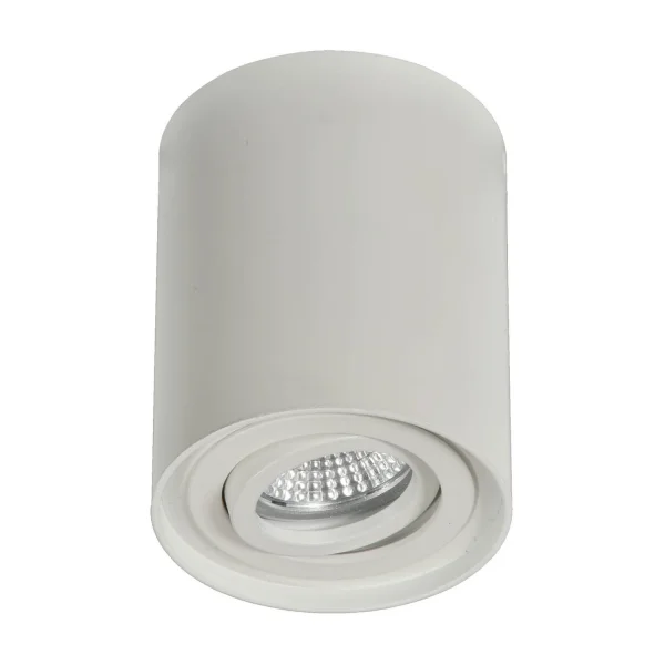 Questo è un faretto di superficie rotondo che è fatto di alluminio con una finitura bianca.