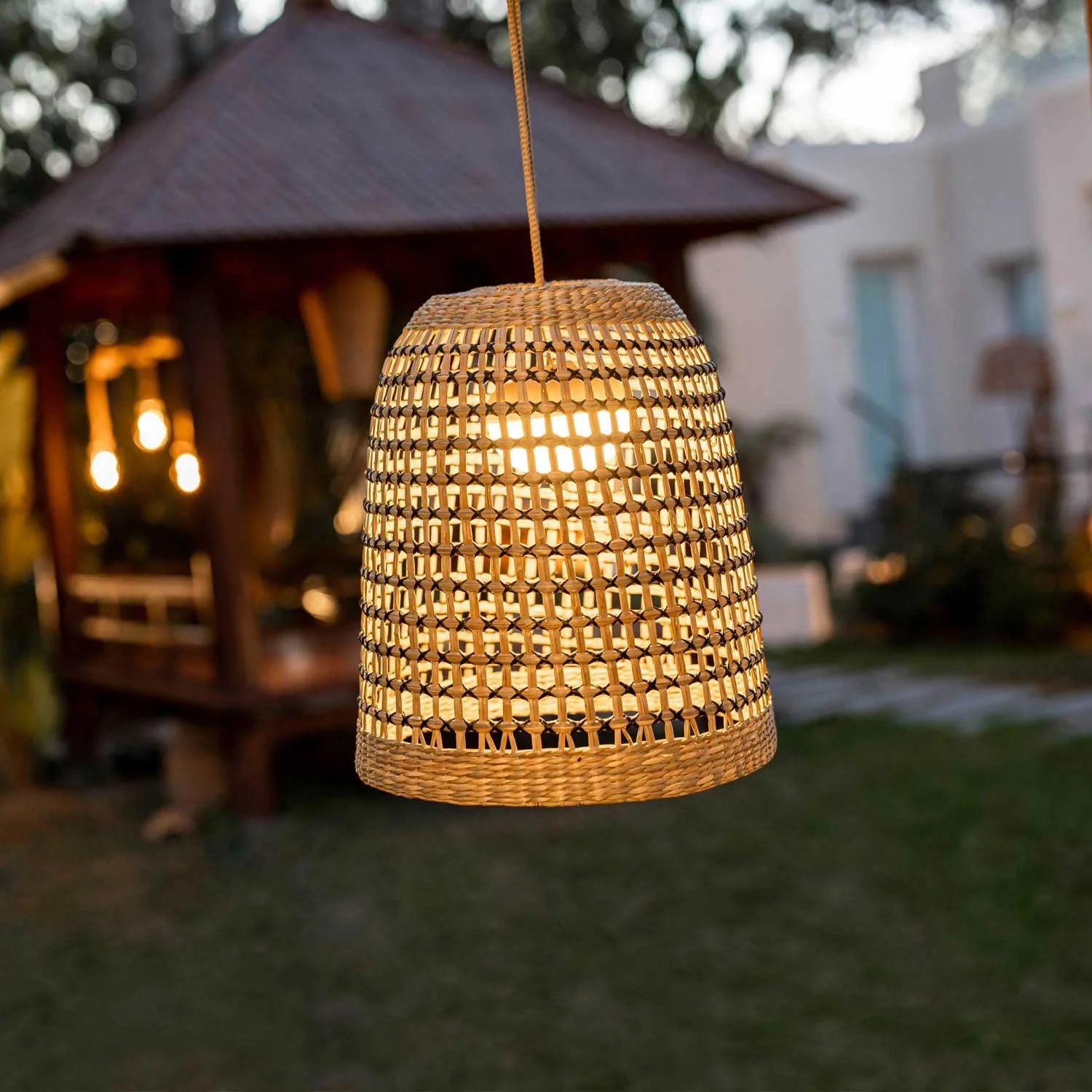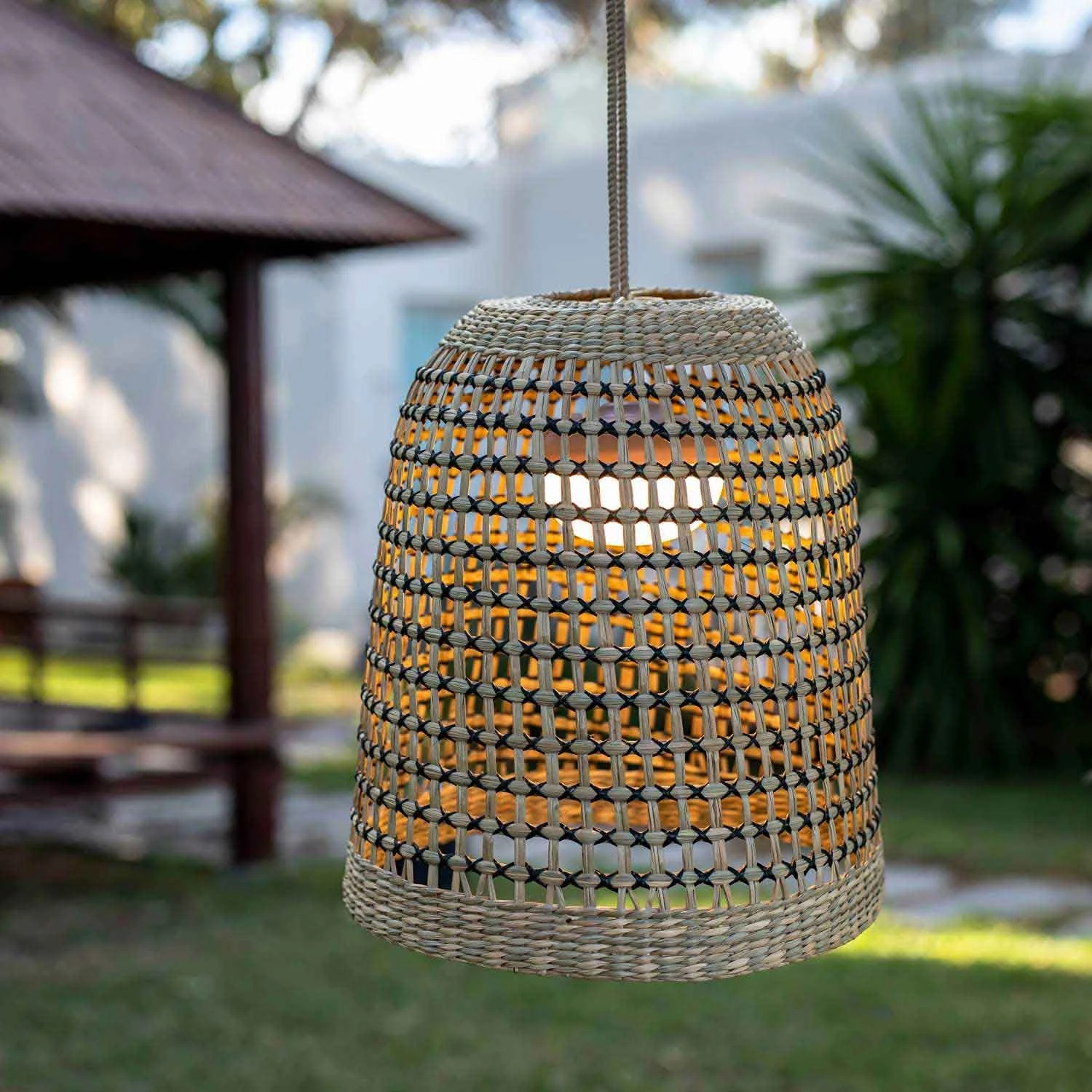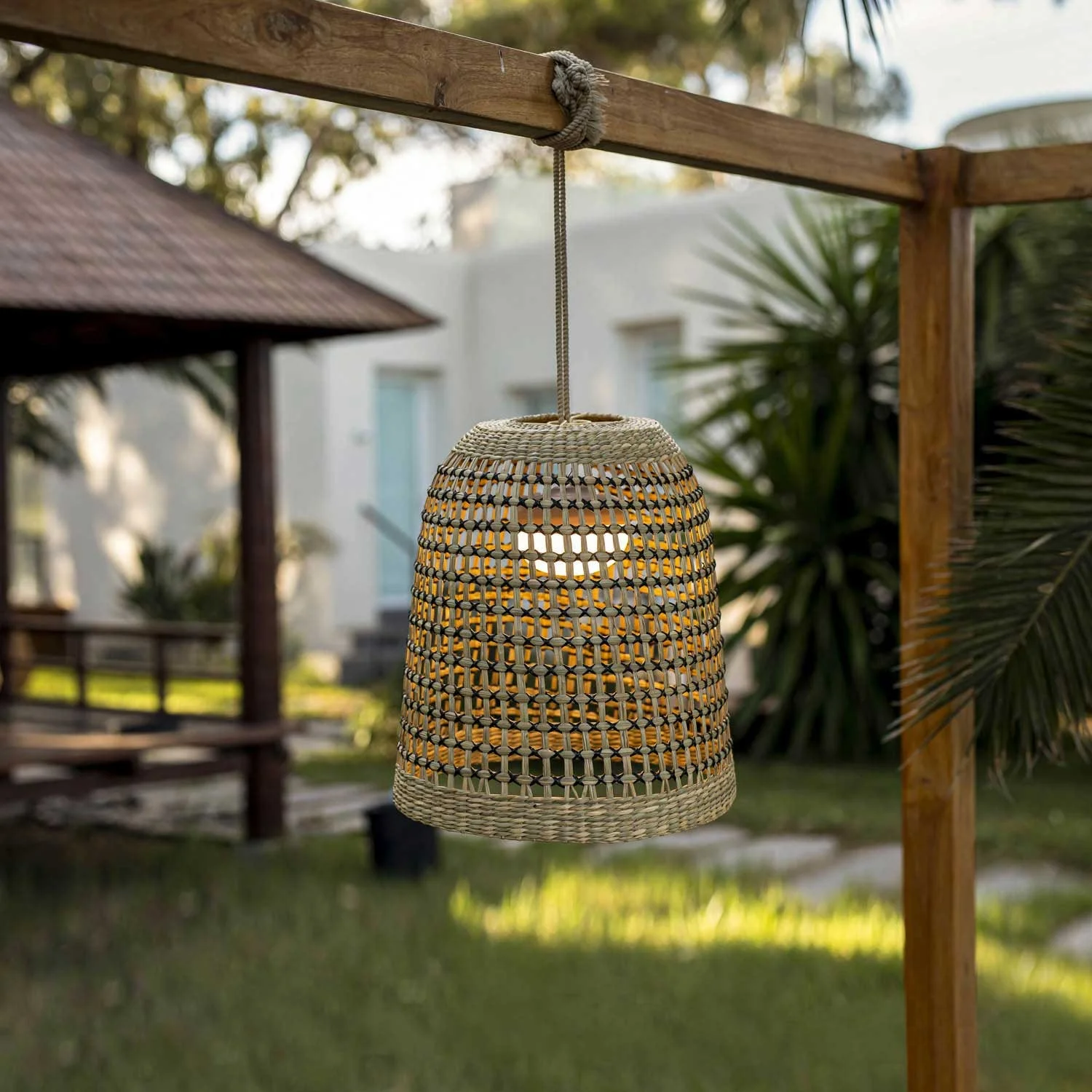La lampada a sospensione Positano di Newgarden è fatta di fibre naturali, non richiede installazione e ha una sospensione di 3 metri.
