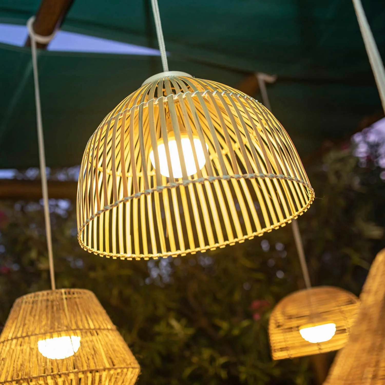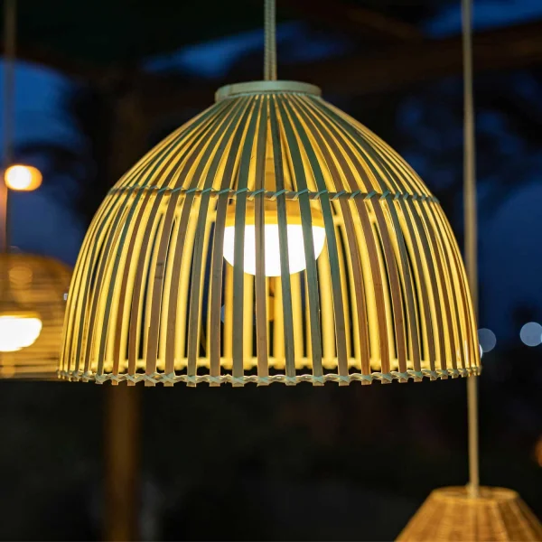 La lampada a sospensione a batteria per esterni Reona è intrecciata a mano con fibre naturali e diventerà l'accessorio di illuminazione essenziale per decorare feste, eventi o per la vostra casa.