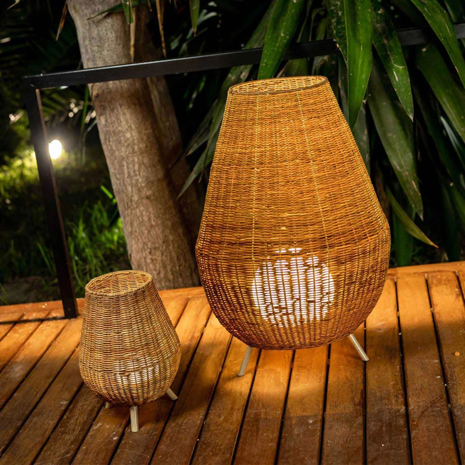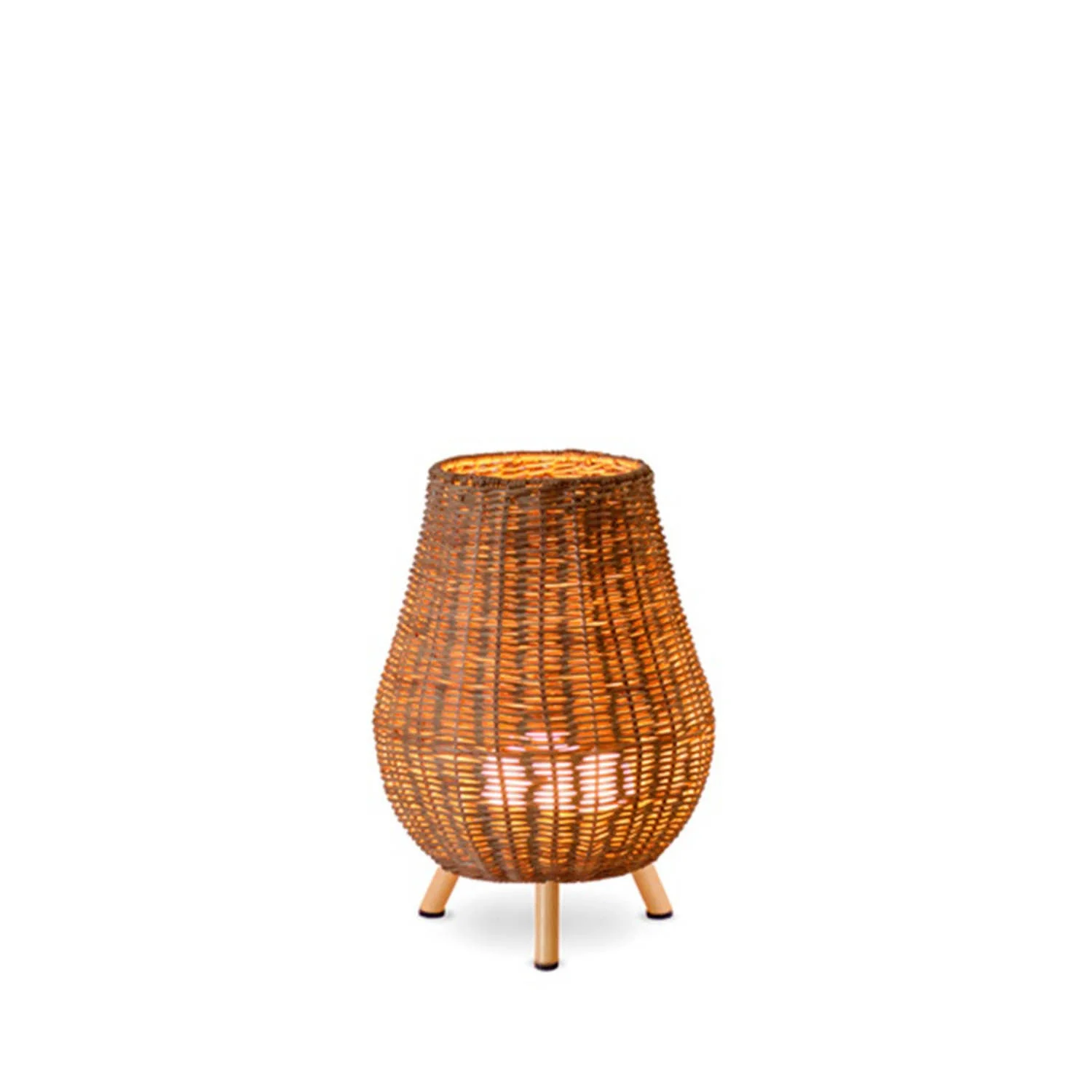 È una lampada a batteria per esterni e interni, realizzata in fibre naturali e intrecciata a mano.