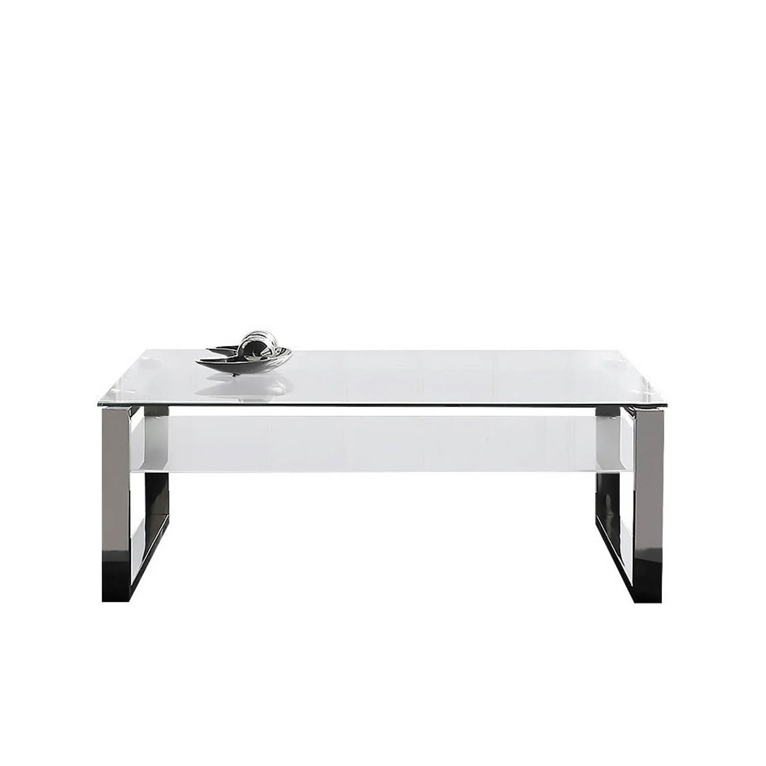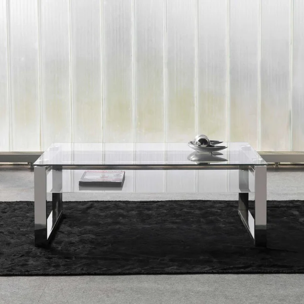 Si tratta di un tavolino laterale in vetro temperato trasparente e una struttura in acciaio lucido. Ha un vassoio in vetro temperato acidato. Il vetro superiore ha uno spessore di 8 mm ed è elettrosaldato su piastre avvitate alle gambe.