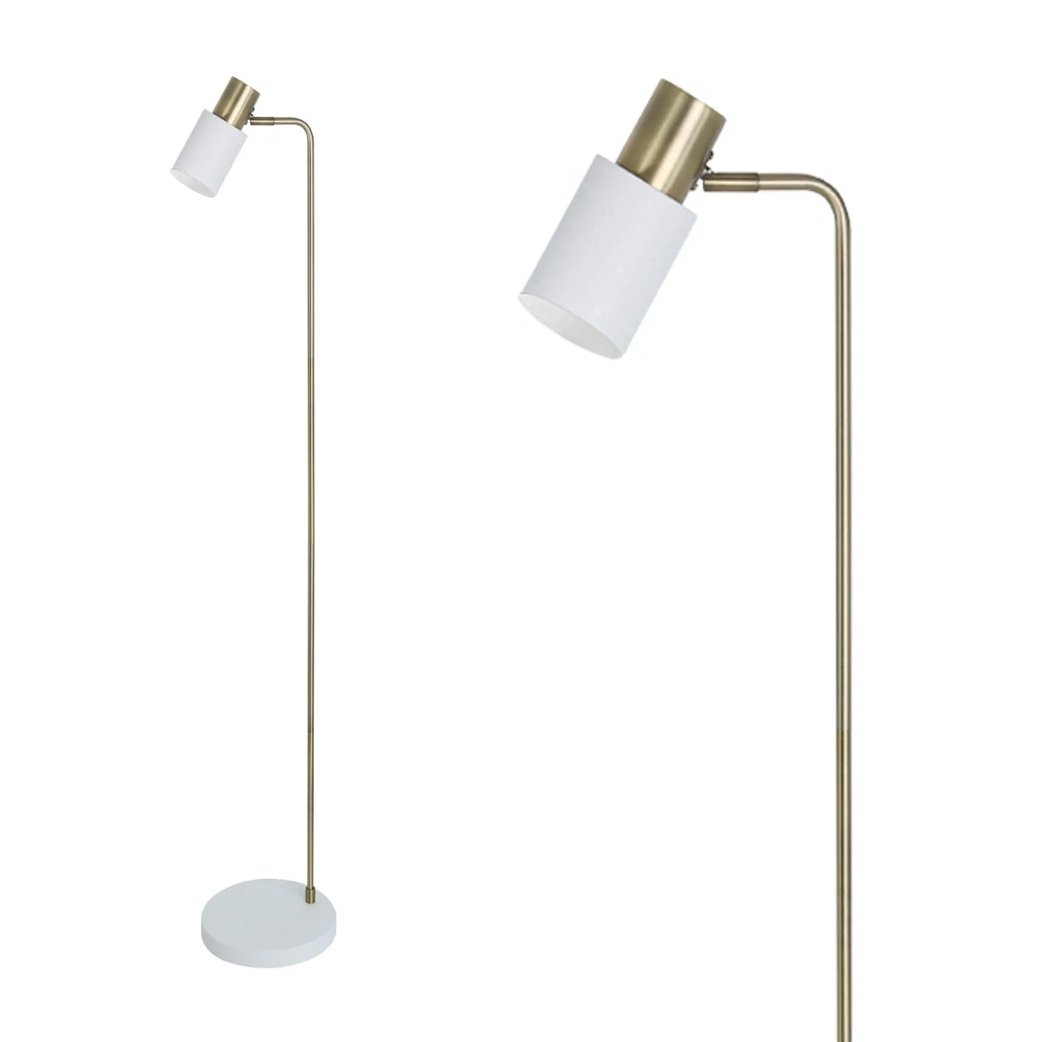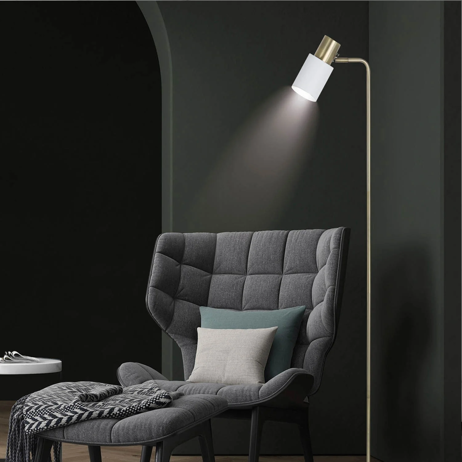 Si tratta di una lampada da terra in metallo con una finitura bianca e pelle. La testa è regolabile, misura 8 cm di diametro e 16 cm di altezza.