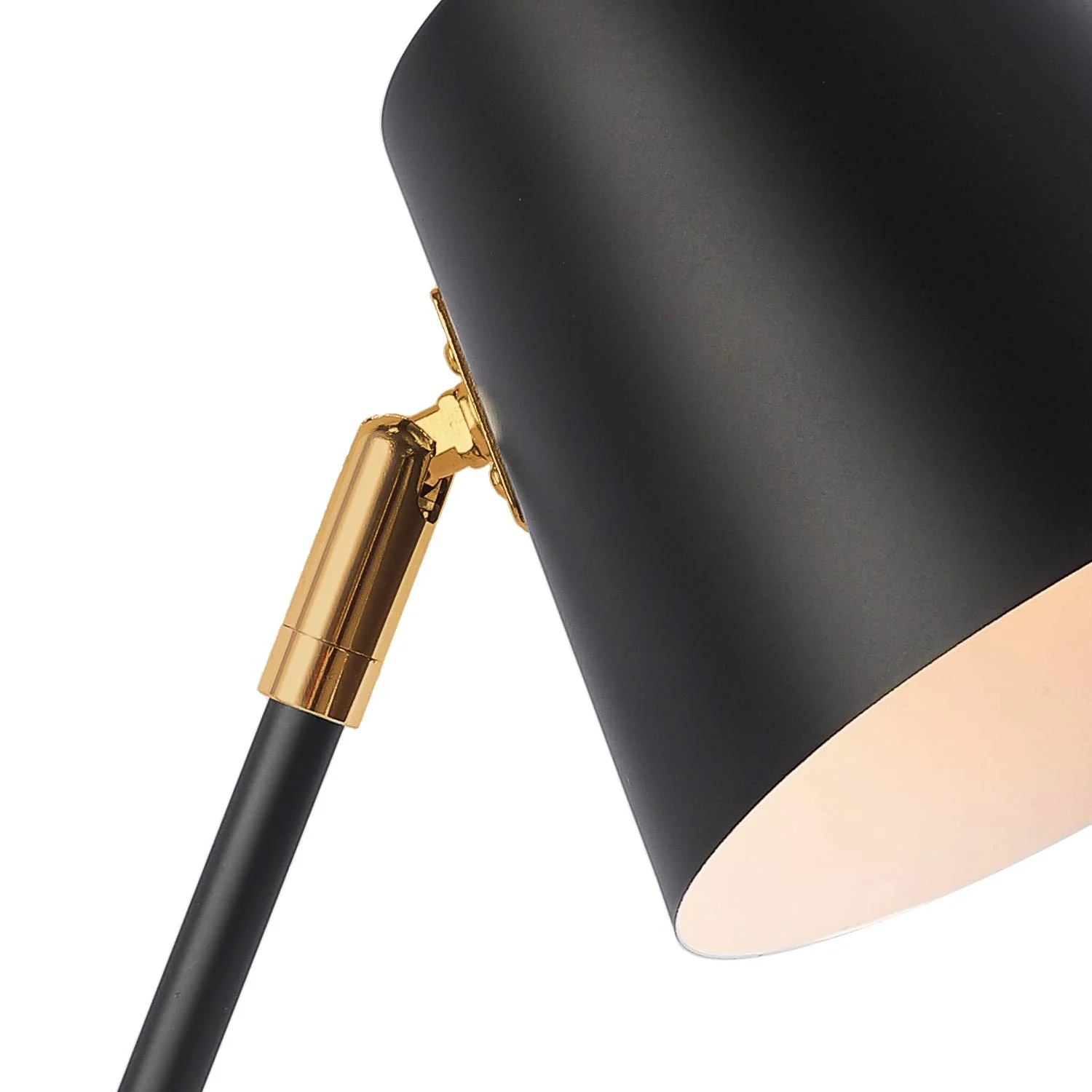 Si tratta di una lampada da tavolo che offre un design molto originale che è fatto di acciaio verniciato con una finitura nera e oro. L'interno dell'ombra è bianco.