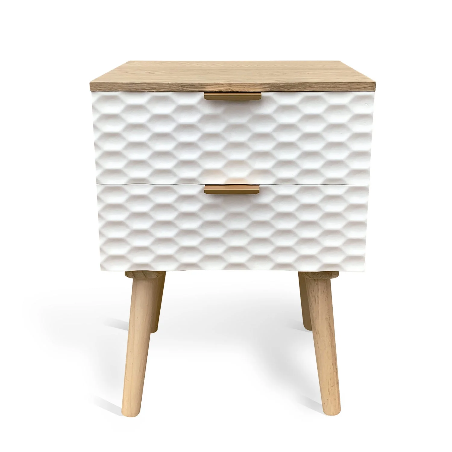I frontali dei cassetti hanno un design ondulato a nido d'ape e sono fatti di MDF laccato in bianco. La superficie superiore è in legno di frassino e le gambe sono in legno di pino con una finitura naturale.