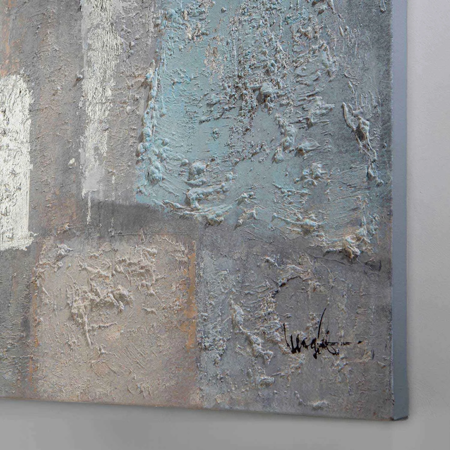 Si tratta di un dipinto in acrilico con dettagli in foglia d'argento, montato su un telaio a barella.