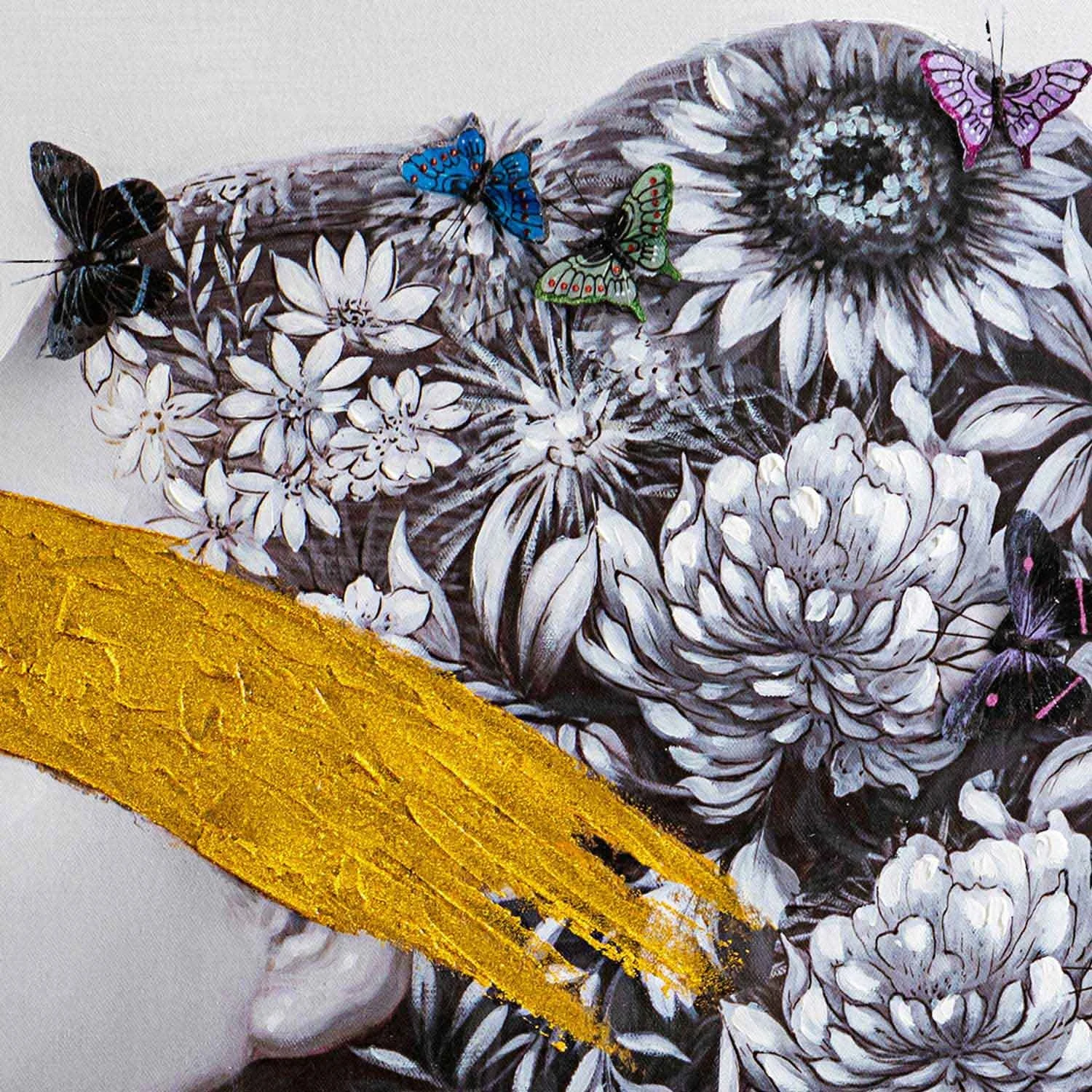 Si tratta di un dipinto in acrilico con dettagli in oro, montato su un telaio a barella.