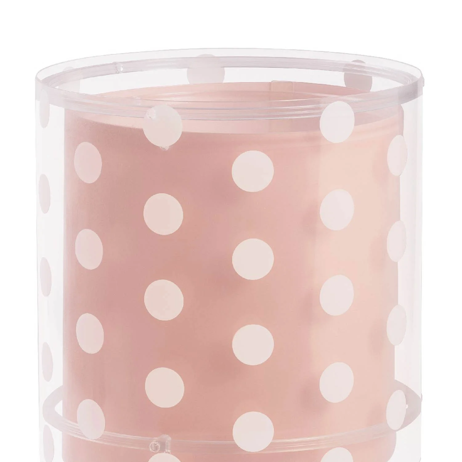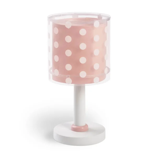 È una lampada da tavolo con un motivo di piccoli punti bianchi su uno sfondo color corallo.