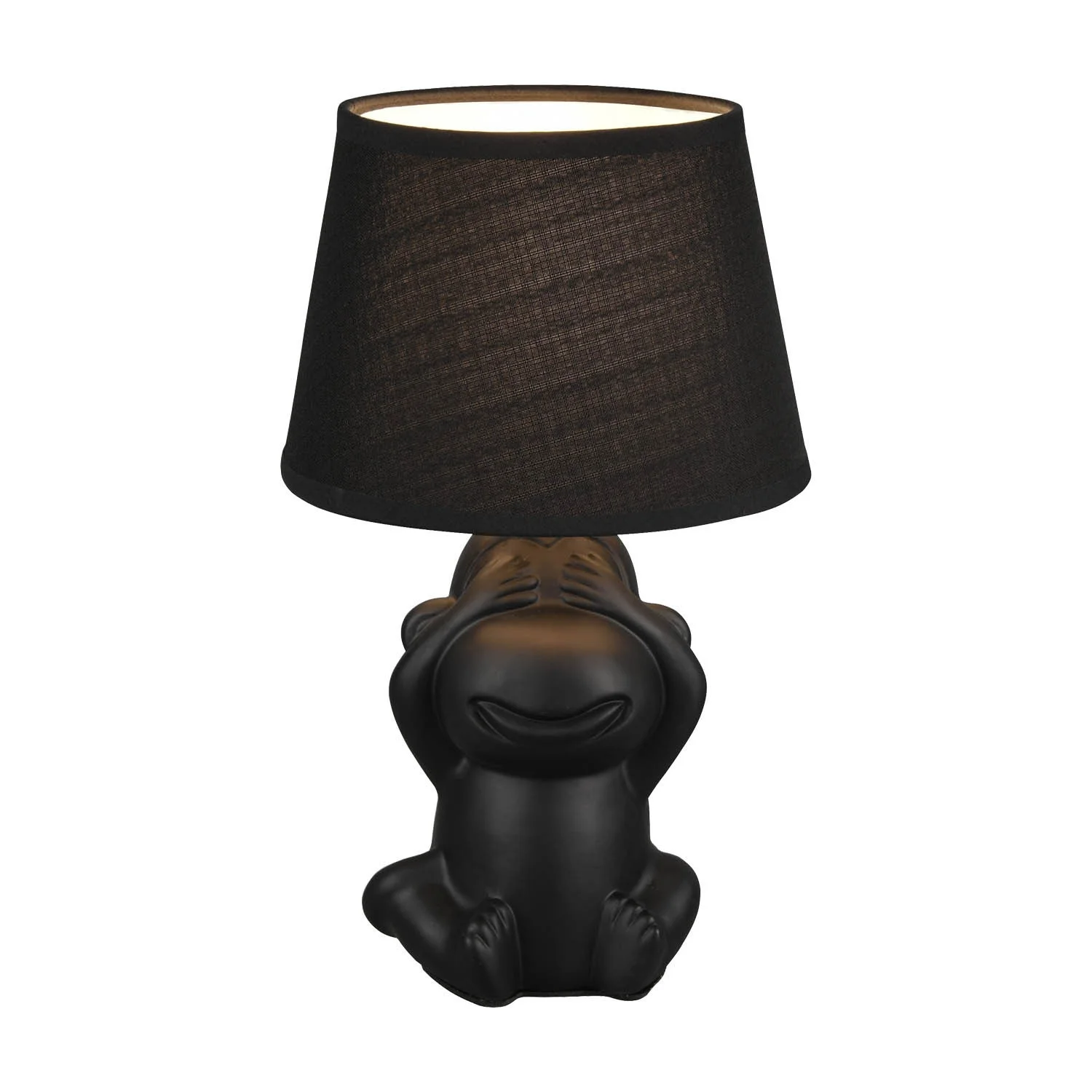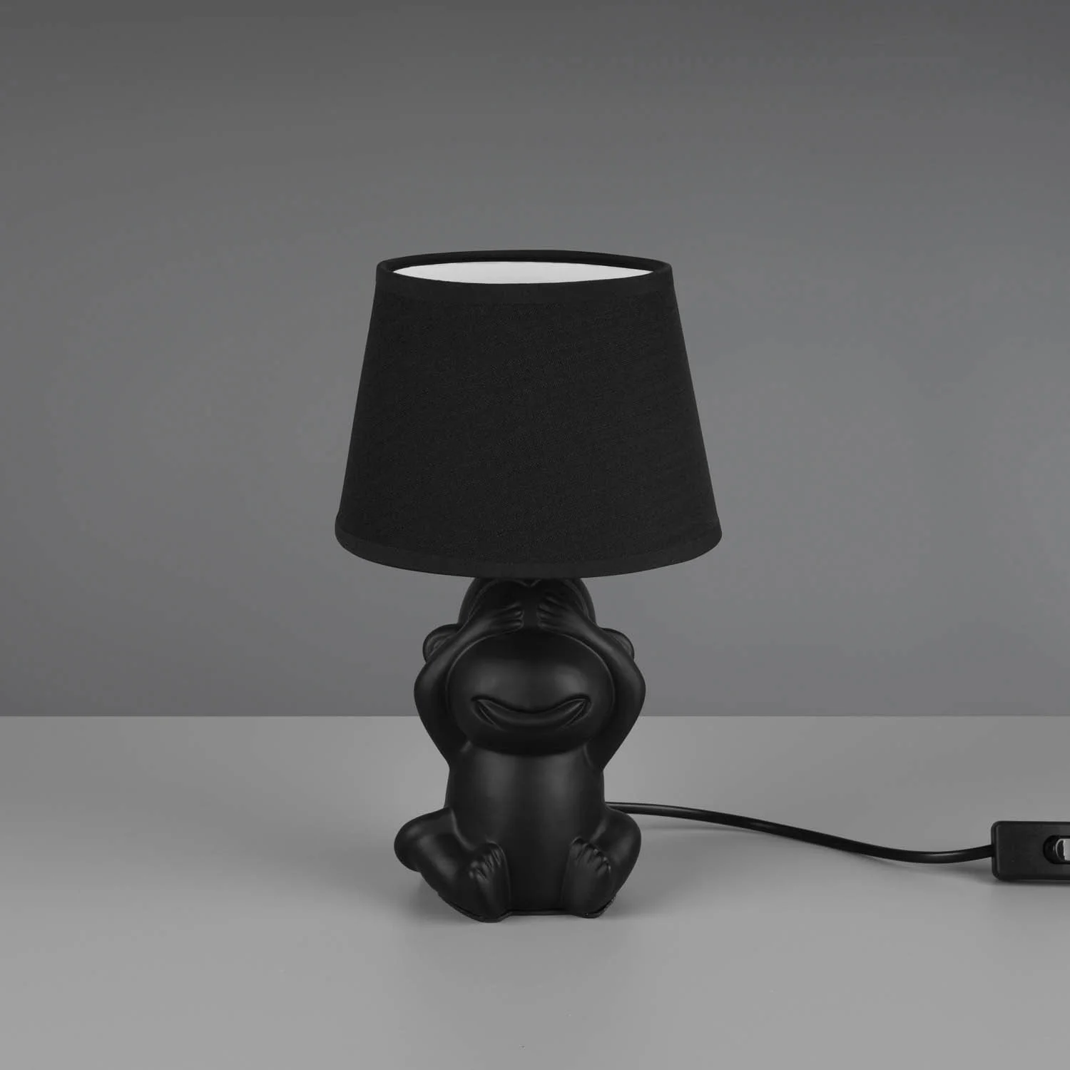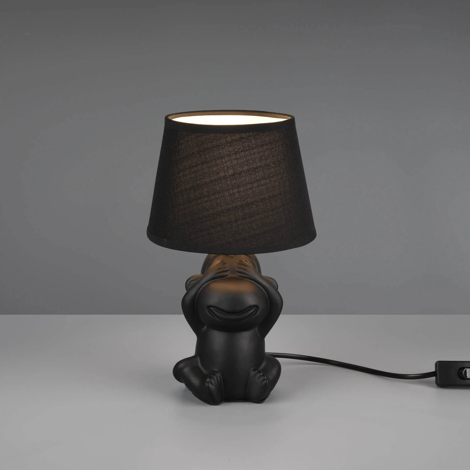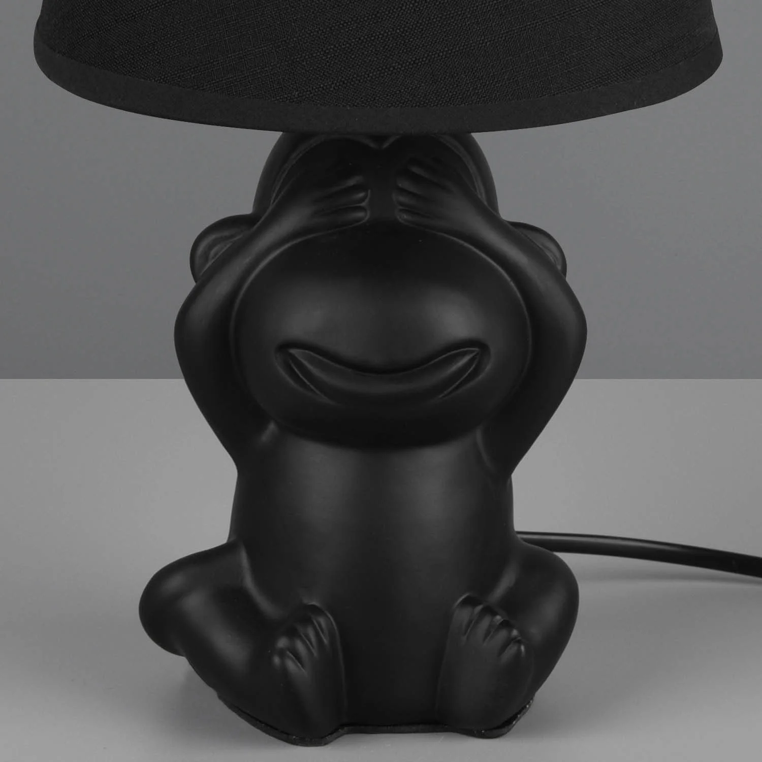 La base rappresenta una scimmietta seduta con le mani che coprono gli occhi, è realizzata in ceramica nera opaca e il paralume è in tessuto nero.
