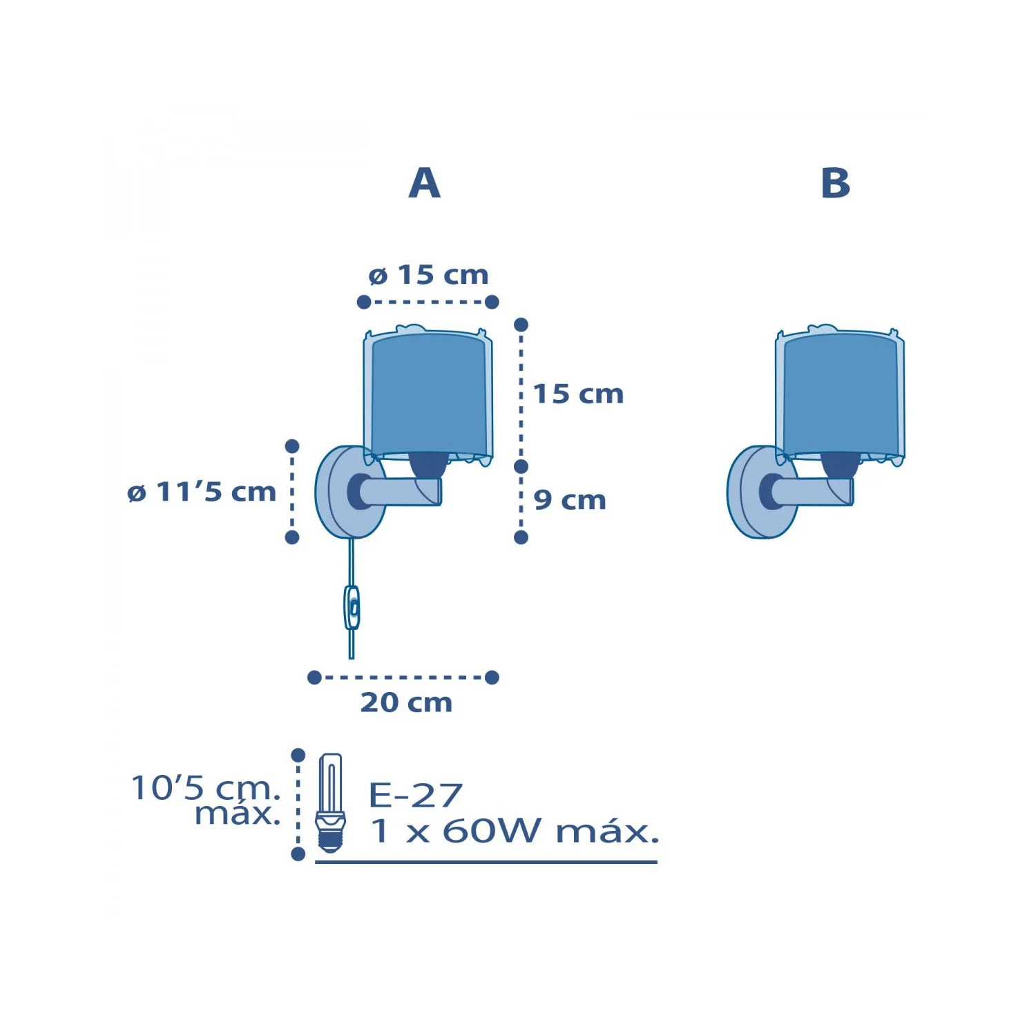 Funziona con una lampadina E27 fino a 15W LED (non inclusa) e si collega direttamente alla rete elettrica, garantendo un uso sicuro e pratico. La sua struttura di colore blu si abbina facilmente a qualsiasi decorazione per bambini, portando allegria e un tocco educativo allo stesso tempo.