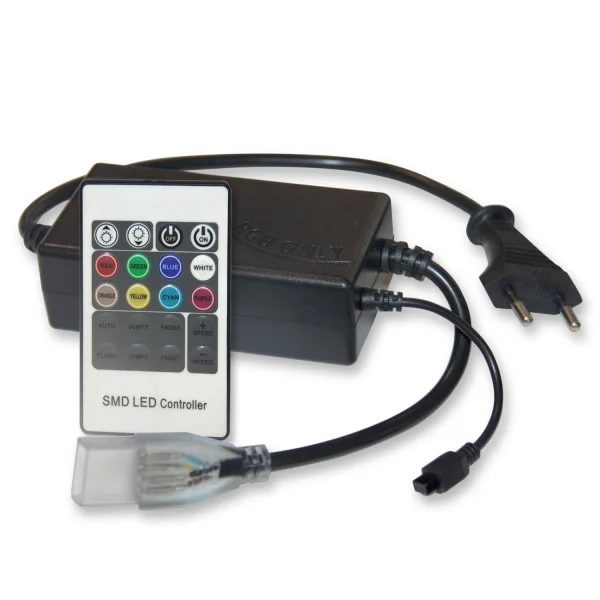 È dotato di un controller interno per poter cambiare i colori della striscia LED RGB con un telecomando con diverse sequenze e un'ampia gamma di colori.