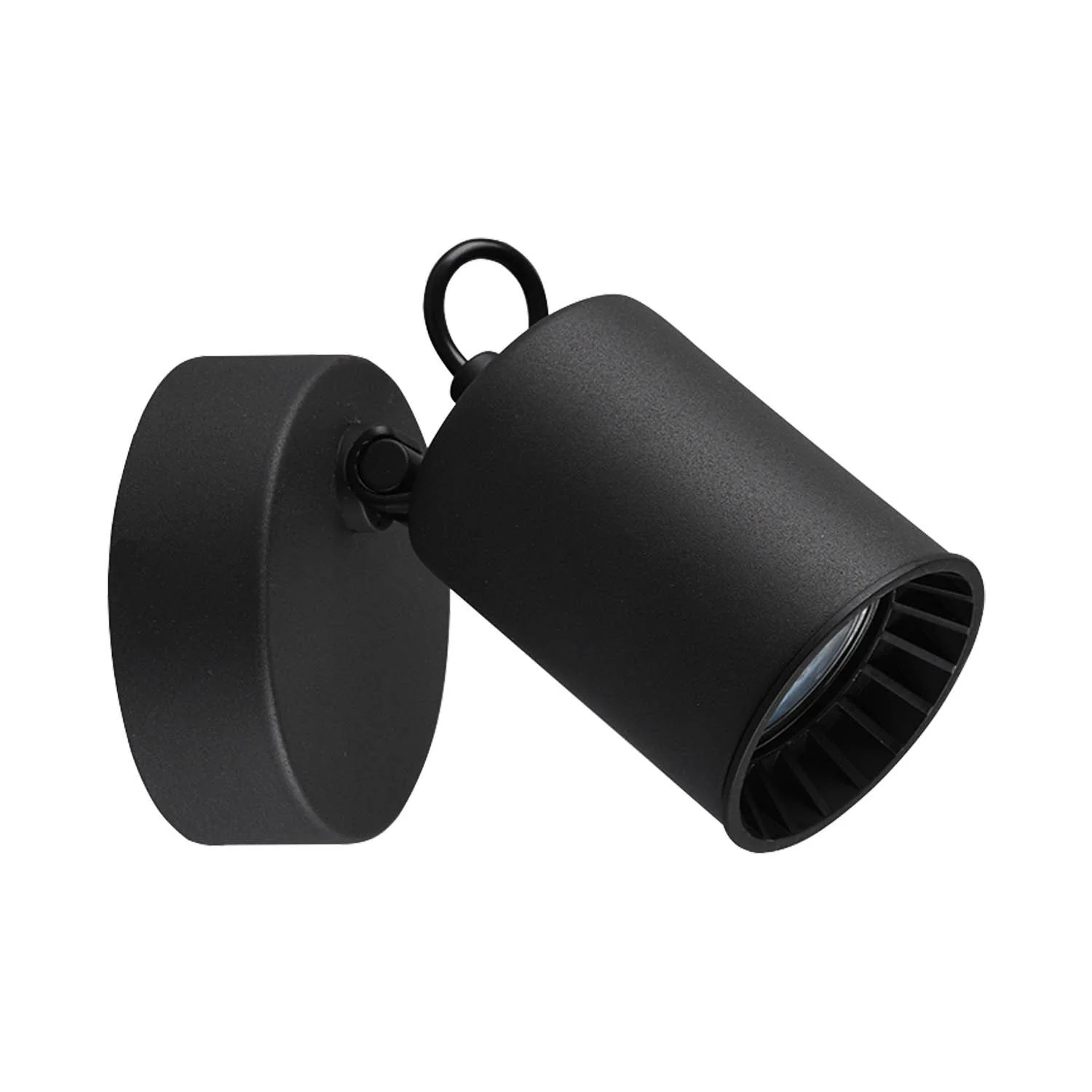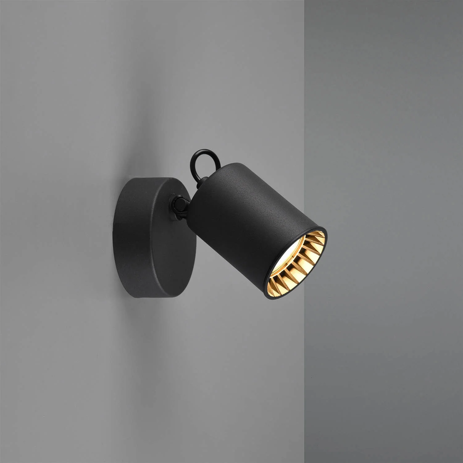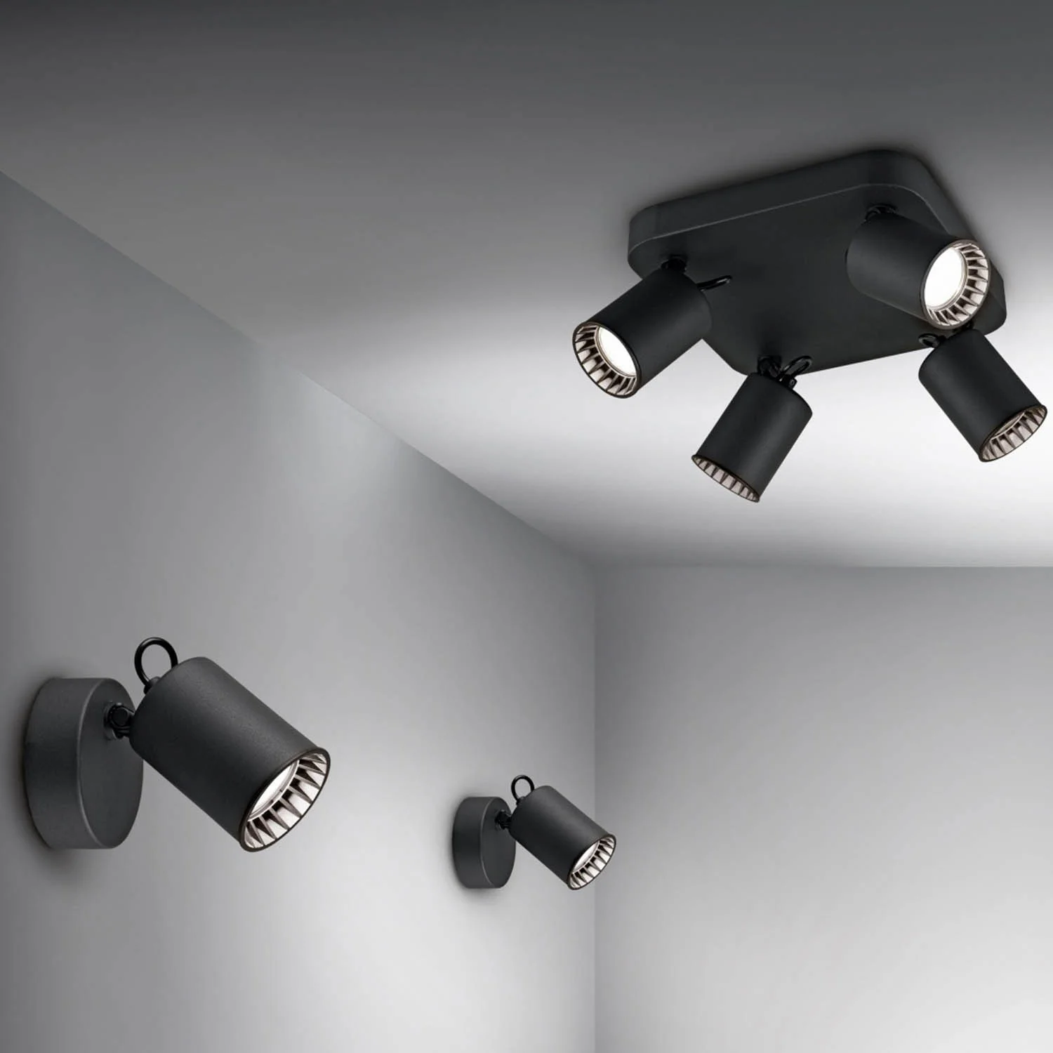 È un faretto adatto al montaggio a soffitto o a parete, realizzato in metallo nero opaco e plastica nera.