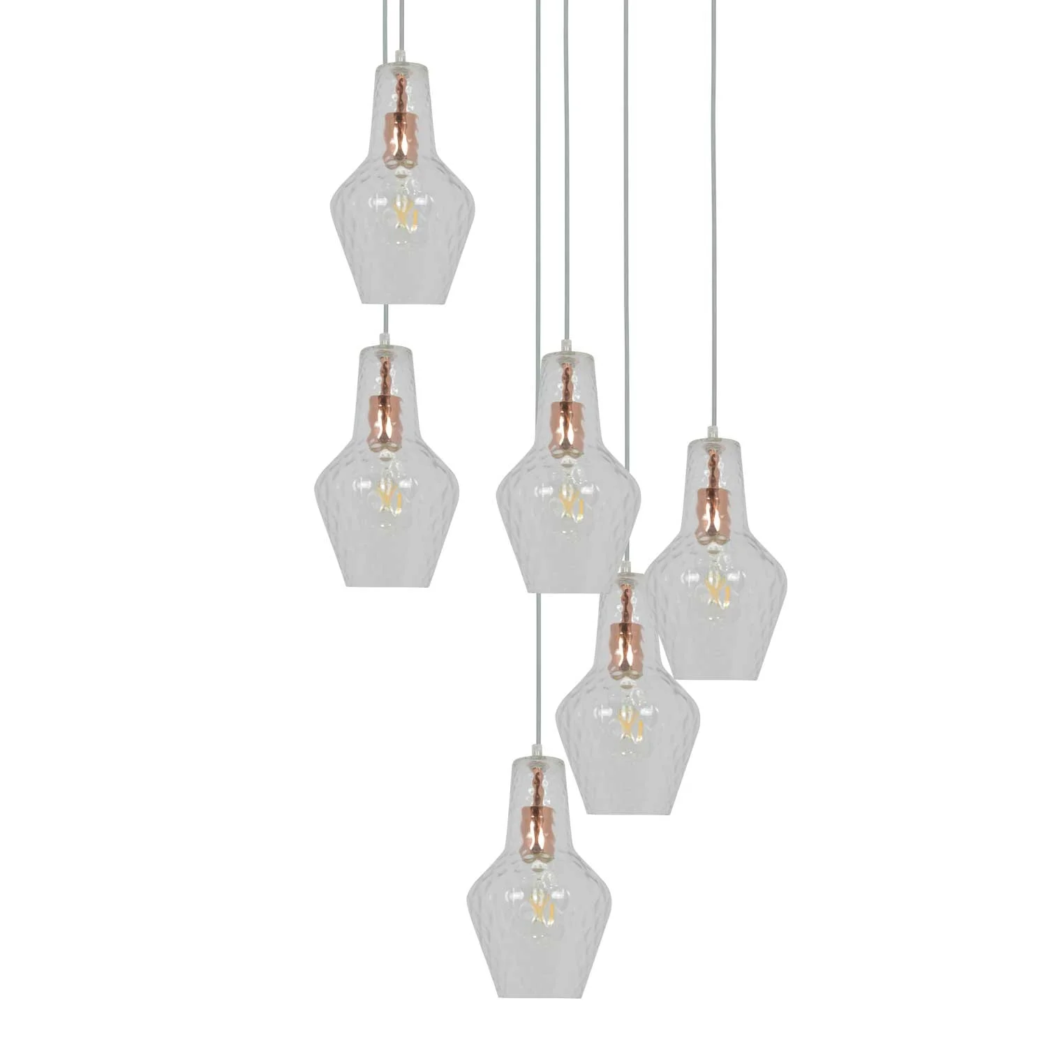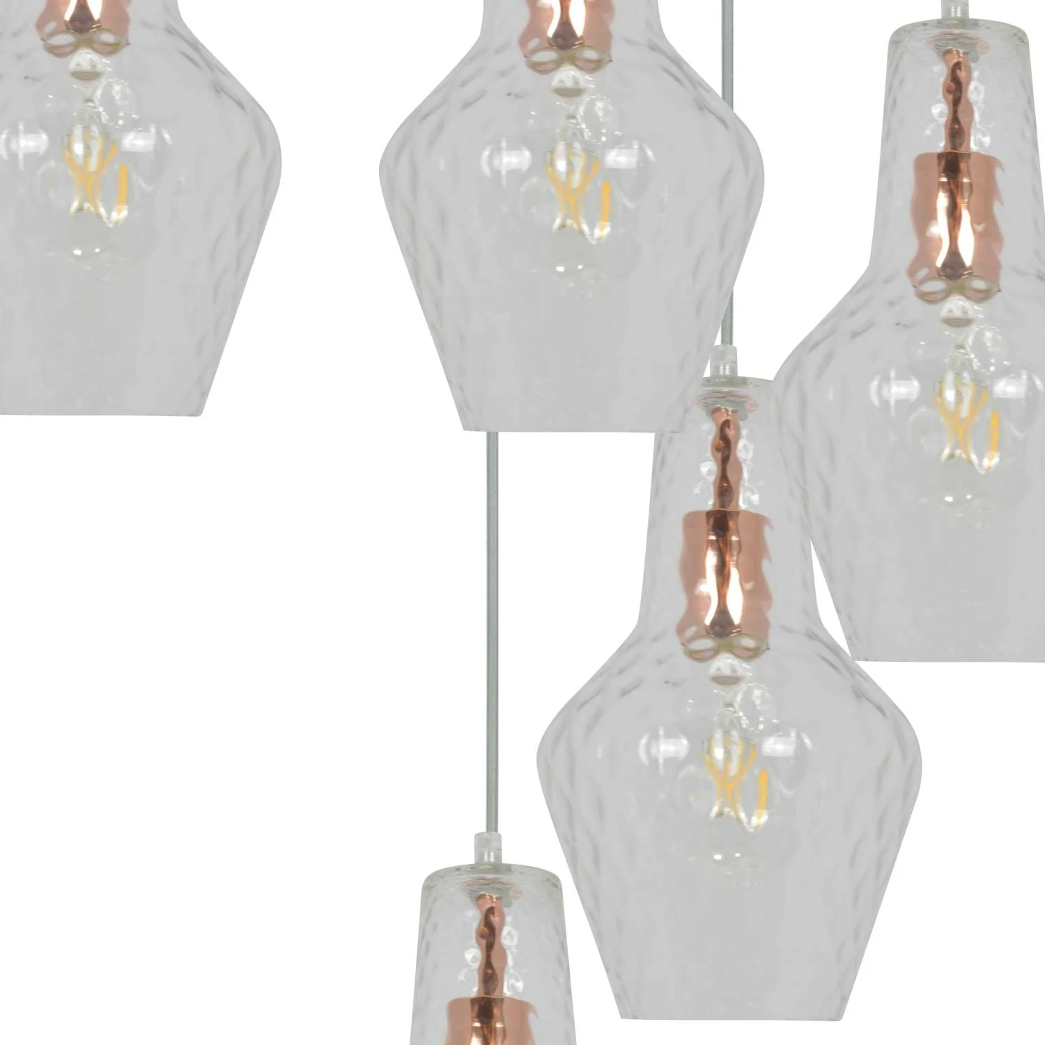 Maverick è una collezione vintage, uno stile che è diventato un punto fermo nelle case e nei locali di tutto il mondo. Maverick è una collezione vintage, uno stile che è diventato un punto fermo nelle case e nei locali di tutto il mondo. Si tratta di un apparecchio di illuminazione la cui struttura è realizzata in acciaio cromato e acciaio oro rosa con un paralume in vetro trasparente. È un apparecchio di illuminazione che si può collocare in stanze come il soggiorno, per la zona delle scale o per decorare qualsiasi tipo di locale. Funziona con 6 lampadine con attacco massimo da 40 W (lampadine non incluse). Misure: 63 cm di diametro x 120 cm di altezza (dalla base al paralume).