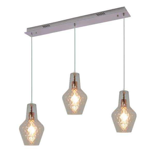 Questa spettacolare lampada da soffitto a 3 luci appartiene alla collezione Maverick ed è realizzata in acciaio cromato e acciaio oro rosa con un paralume in vetro trasparente. Questa spettacolare lampada da soffitto a 3 luci appartiene alla collezione Maverick ed è realizzata in acciaio cromato e acciaio oro rosa con un paralume in vetro trasparente. La sua base è di forma rettangolare e si adatta ad ambienti come il soggiorno, la sala da pranzo o l'isola della cucina. Funziona con 3 lampadine da 40 W al massimo (lampadine non incluse). Misure: 83 cm di larghezza x 18 cm di profondità x 120 cm di altezza (dalla base al paralume).