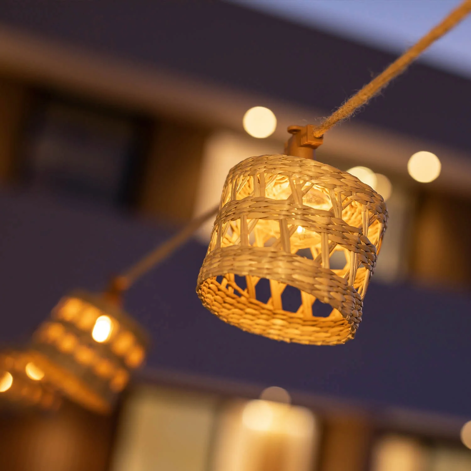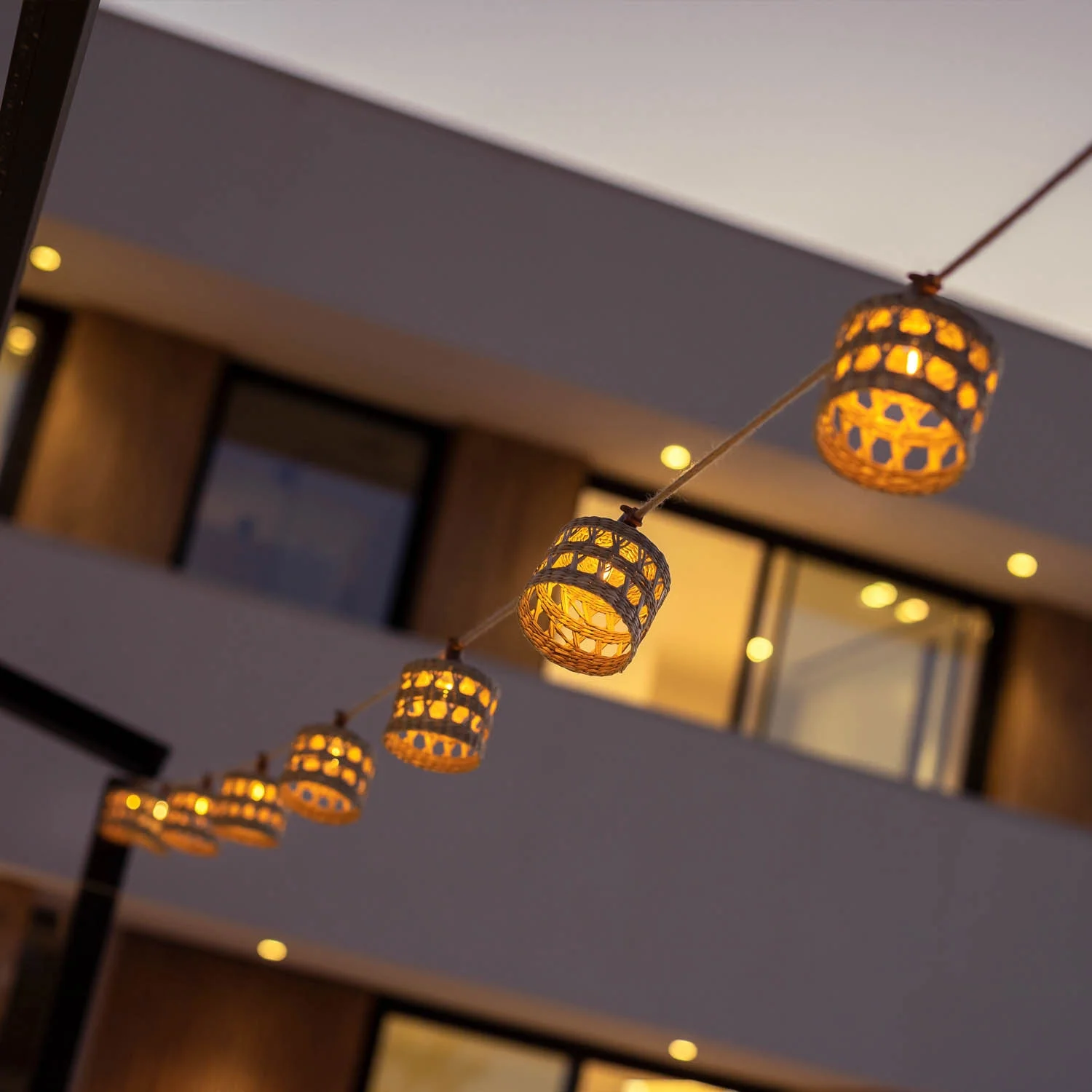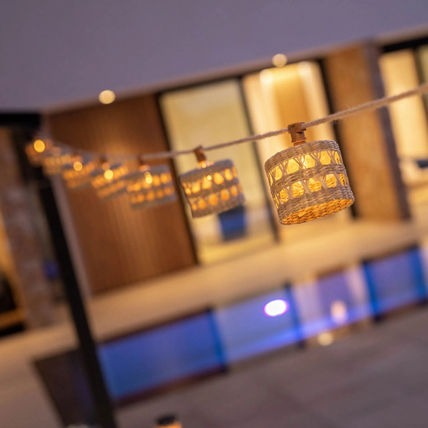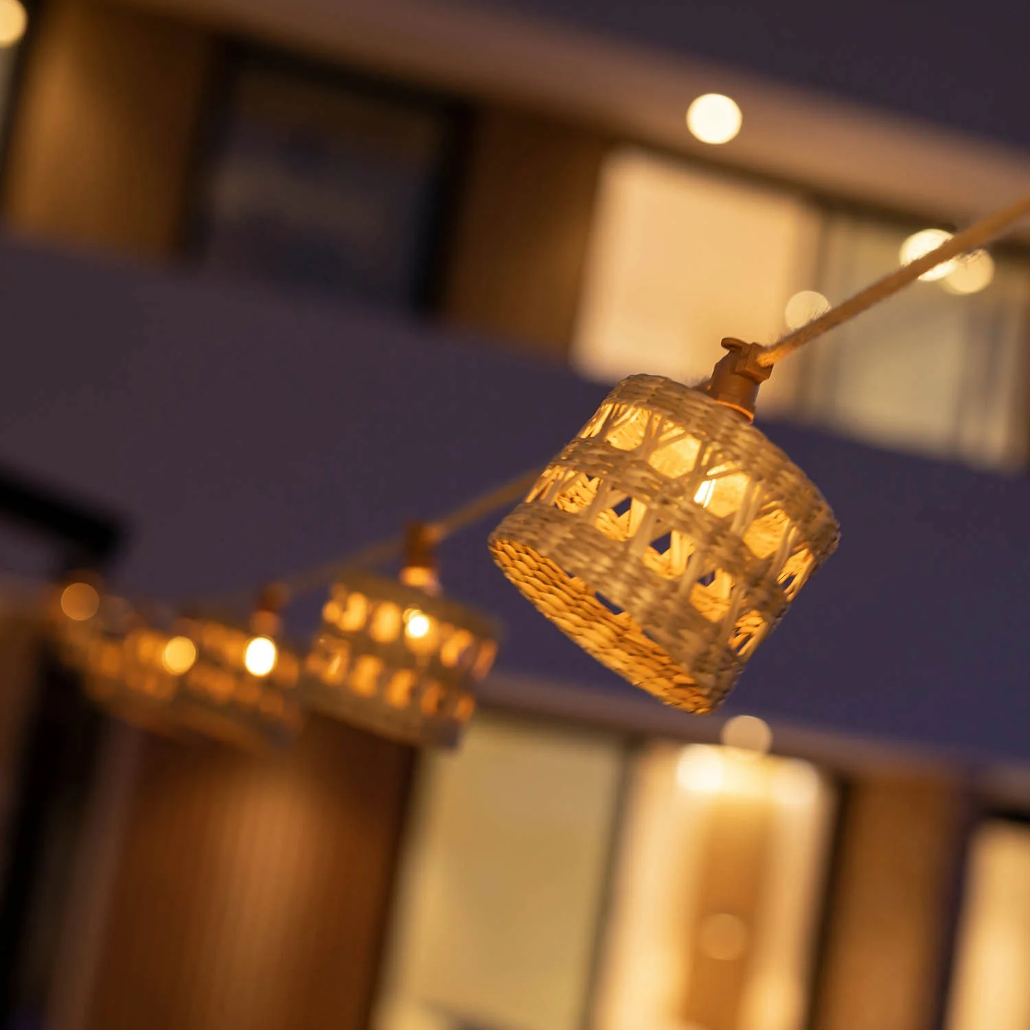 La ghirlanda Alba è composta da 10 paralumi fatti a mano in fibra naturale e cavo di juta lungo 8 metri. I paralumi misurano 10 cm di diametro x 8 cm di altezza.