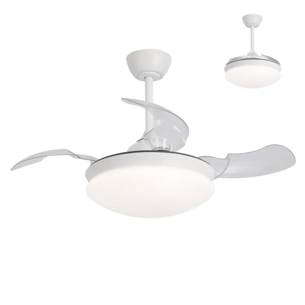 Il Ventilatore Da Soffitto Montreal LED 24W Dimmable 4 Blade Folding DC Motor è la soluzione perfetta per chi cerca una combinazione di stile, efficienza e funzionalità. Questo ventilatore offre un design moderno con le sue pale pieghevoli in PC trasparente e il corpo in alluminio verniciato bianco opaco, ideale per qualsiasi spazio contemporaneo.