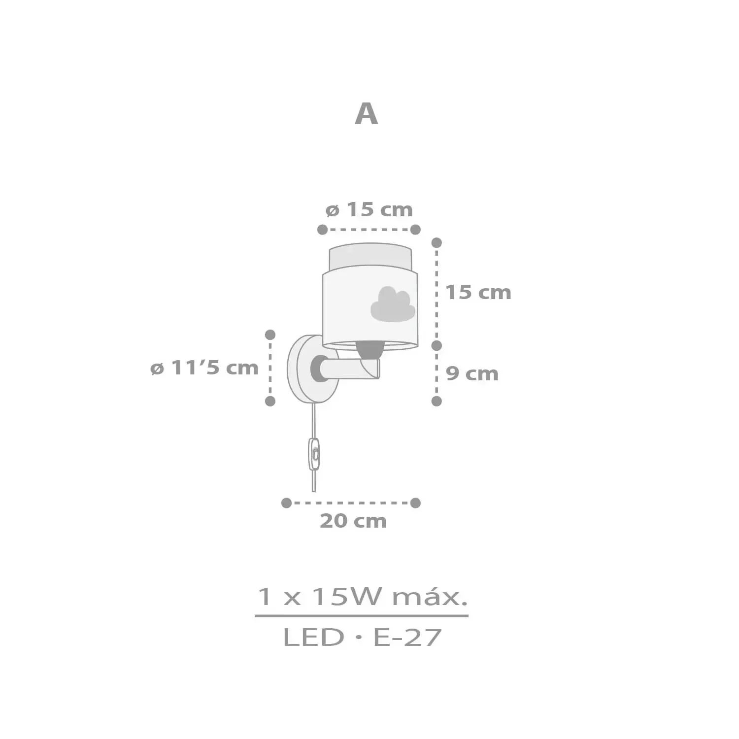 Questo applique presenta un design attraente che include tre piccole nuvole di colore grigio, le quali brillano dolcemente al buio, offrendo un'atmosfera accogliente durante la notte. Realizzato in polipropilene, è leggero e sicuro, ideale per le camere dei bambini. Le sue dimensioni sono compatte: ha un'altezza di 24 cm, un diametro del paralume di 15 cm, una larghezza di 20 cm e una base fissata al muro con un diametro di 11,5 cm.