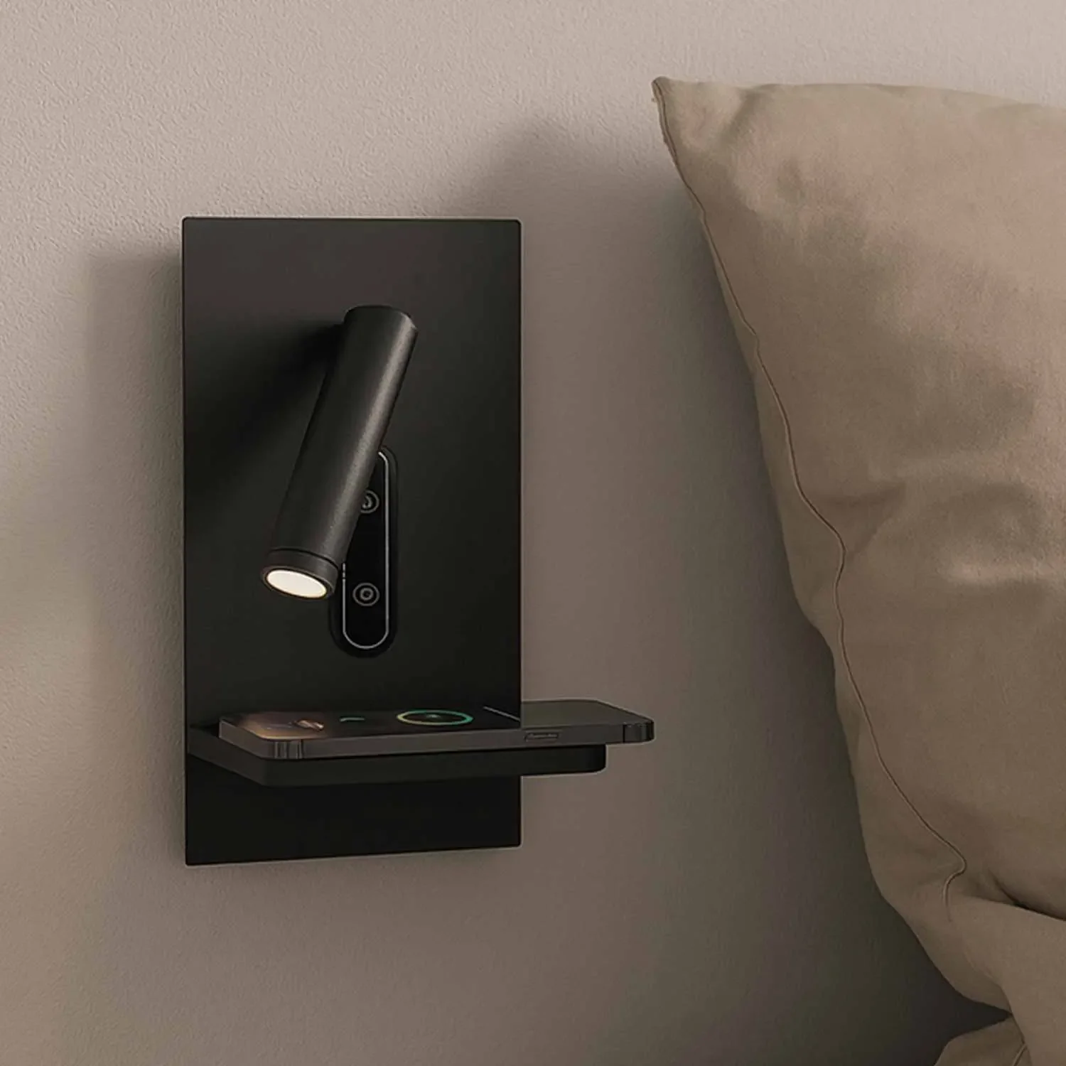 L’applique si installa facilmente a parete con le viti incluse, richiedendo solo la connessione alla rete elettrica. Una volta installato, basta toccare la superficie tattile per accendere, spegnere o regolare l’illuminazione. Posiziona il dispositivo mobile sulla base dell’applique per attivare automaticamente la ricarica senza fili.