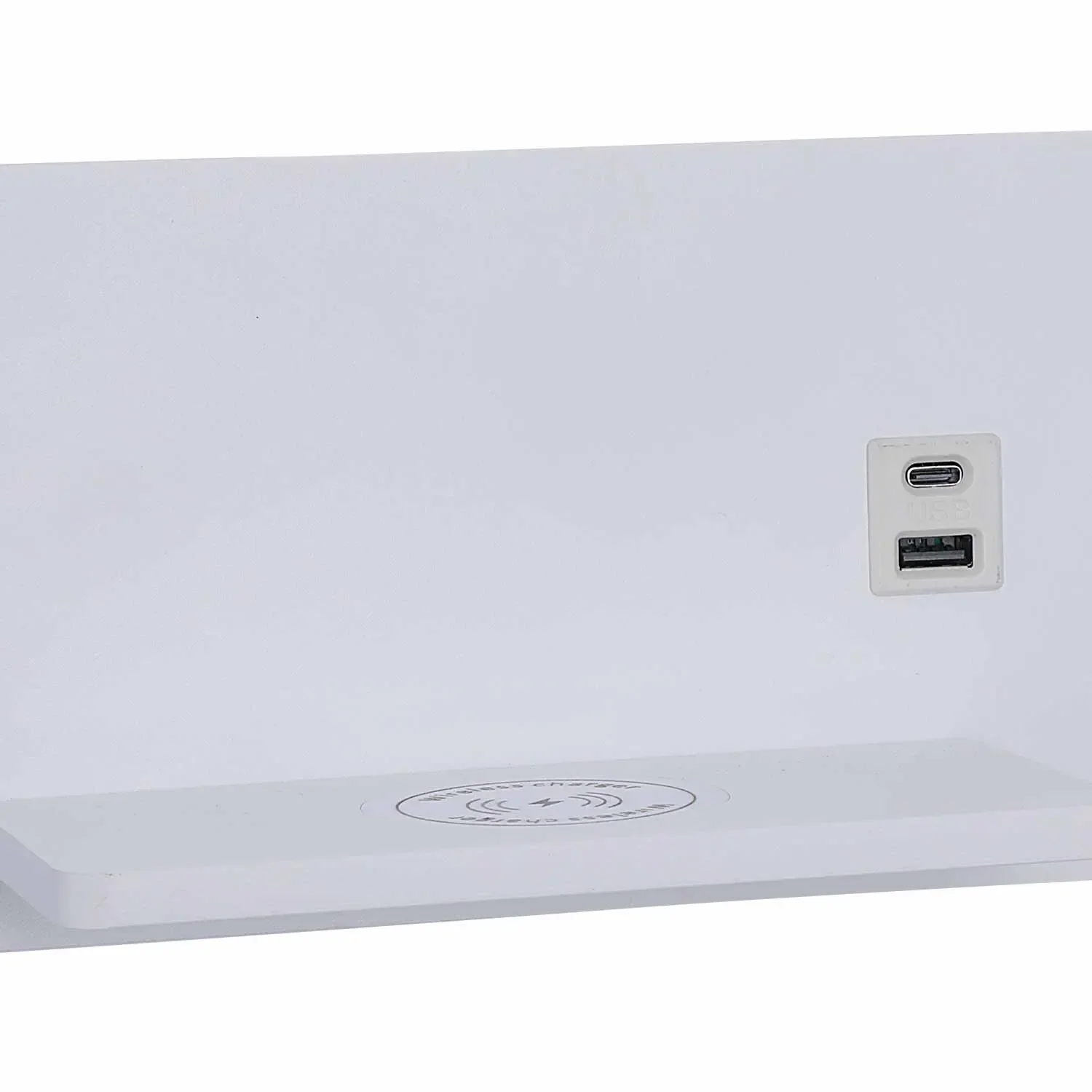 Installazione a parete semplice con collegamento diretto alla rete elettrica. Il controllo tattile integrato consente una gestione intuitiva della luce, mentre la superficie di ricarica senza fili facilita l’uso quotidiano dei dispositivi compatibili. Progettata esclusivamente per interni.