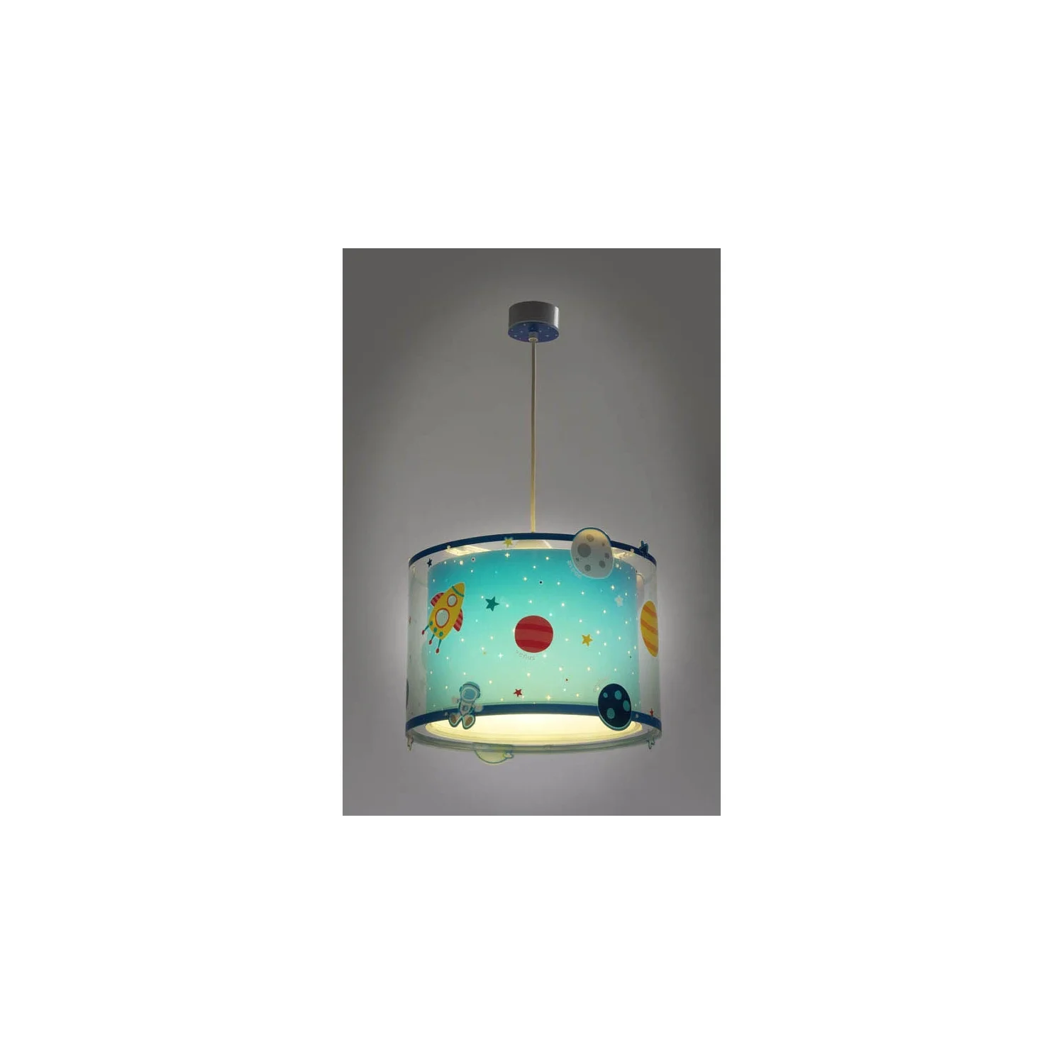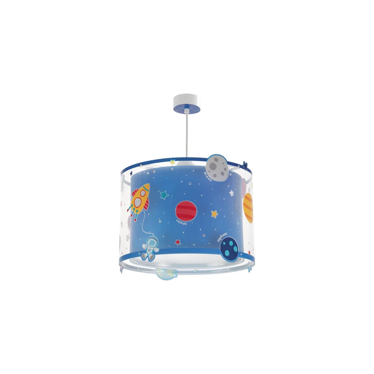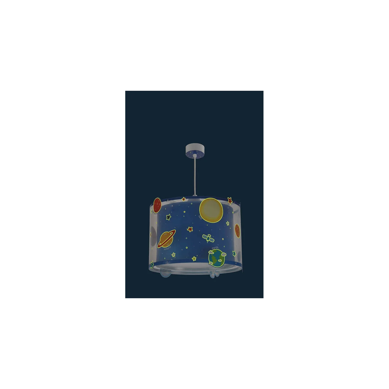 PLANETS CHILDREN LAMPADA A PENSIONE è una lampada da soffitto a una luce, composta da un rosone in PVC con disegni di pianeti e da un secondo pezzo blu sempre con disegni che consiste in due paralumi anch'essi in PVC.